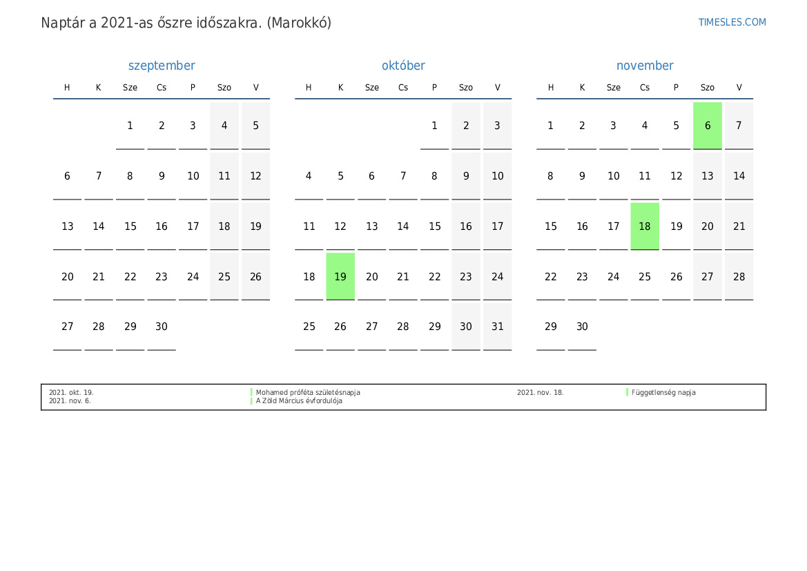 Töltse le és nyomtassa ki az ünnepnapokkal és hétvégékkel ellátott PDF naptárat Marokkóért 2021 őszre