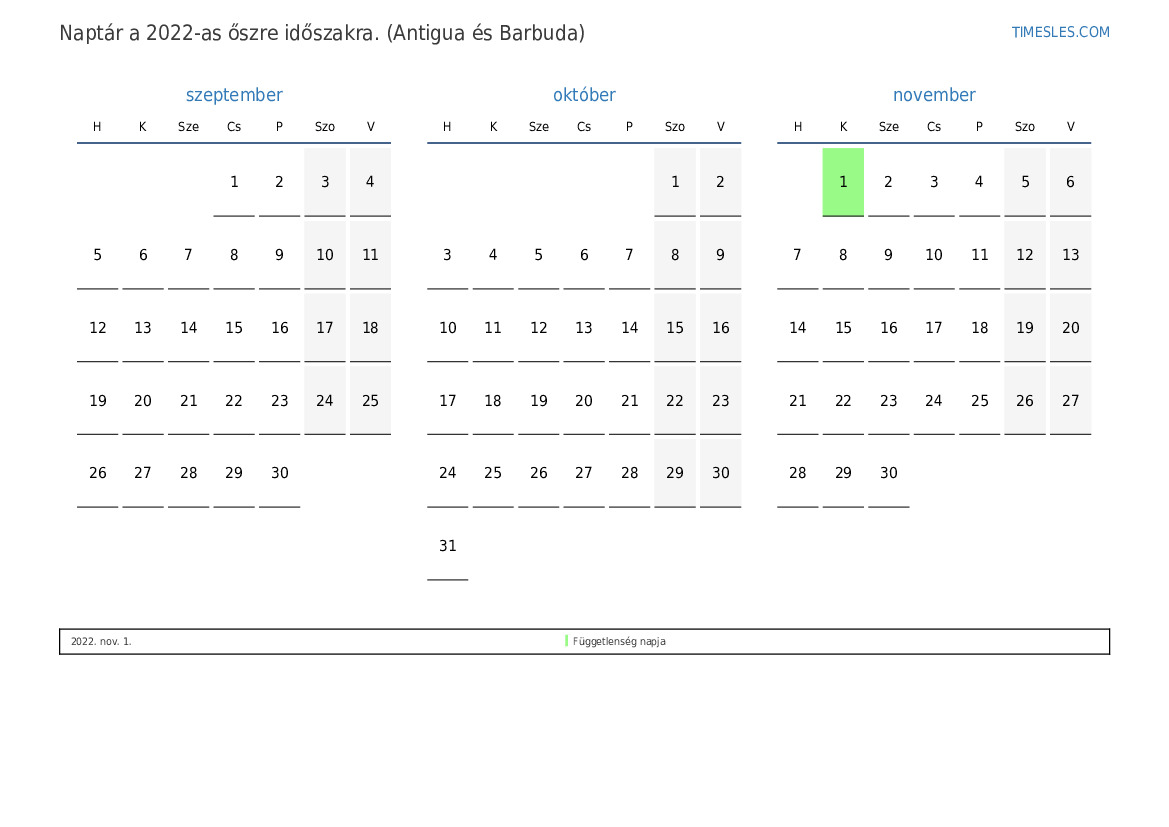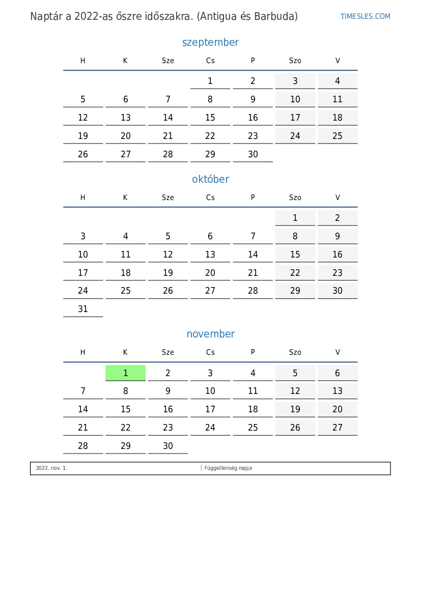 Töltse le és nyomtassa ki az ünnepnapokkal és hétvégékkel ellátott PDF naptárat Antigua és Barbuda számára 2022 őszre