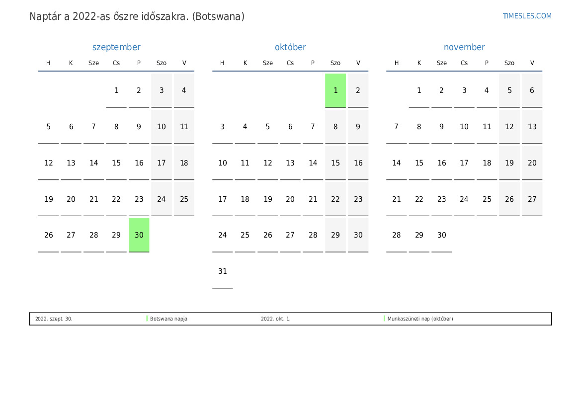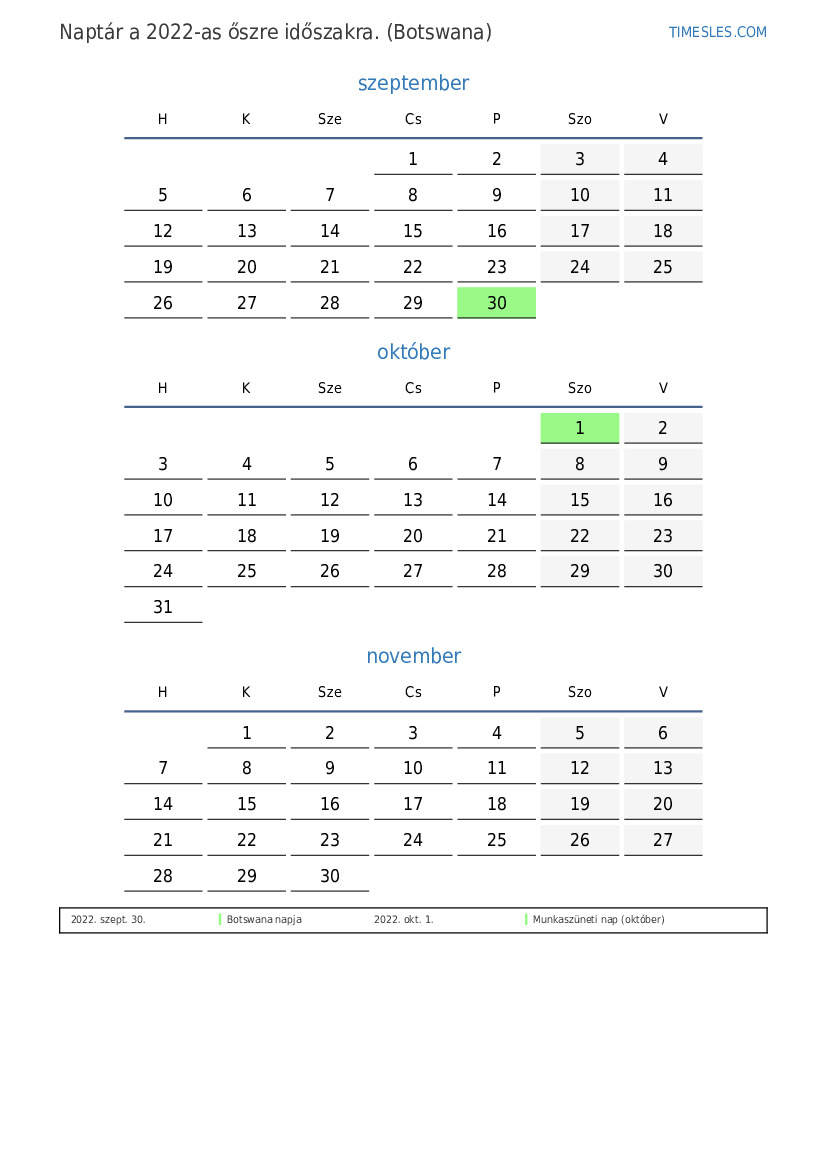 Töltse le és nyomtassa ki az ünnepnapokkal és hétvégékkel ellátott PDF naptárat Botswanának 2022 őszre