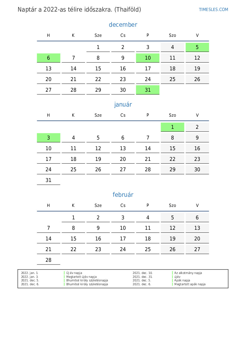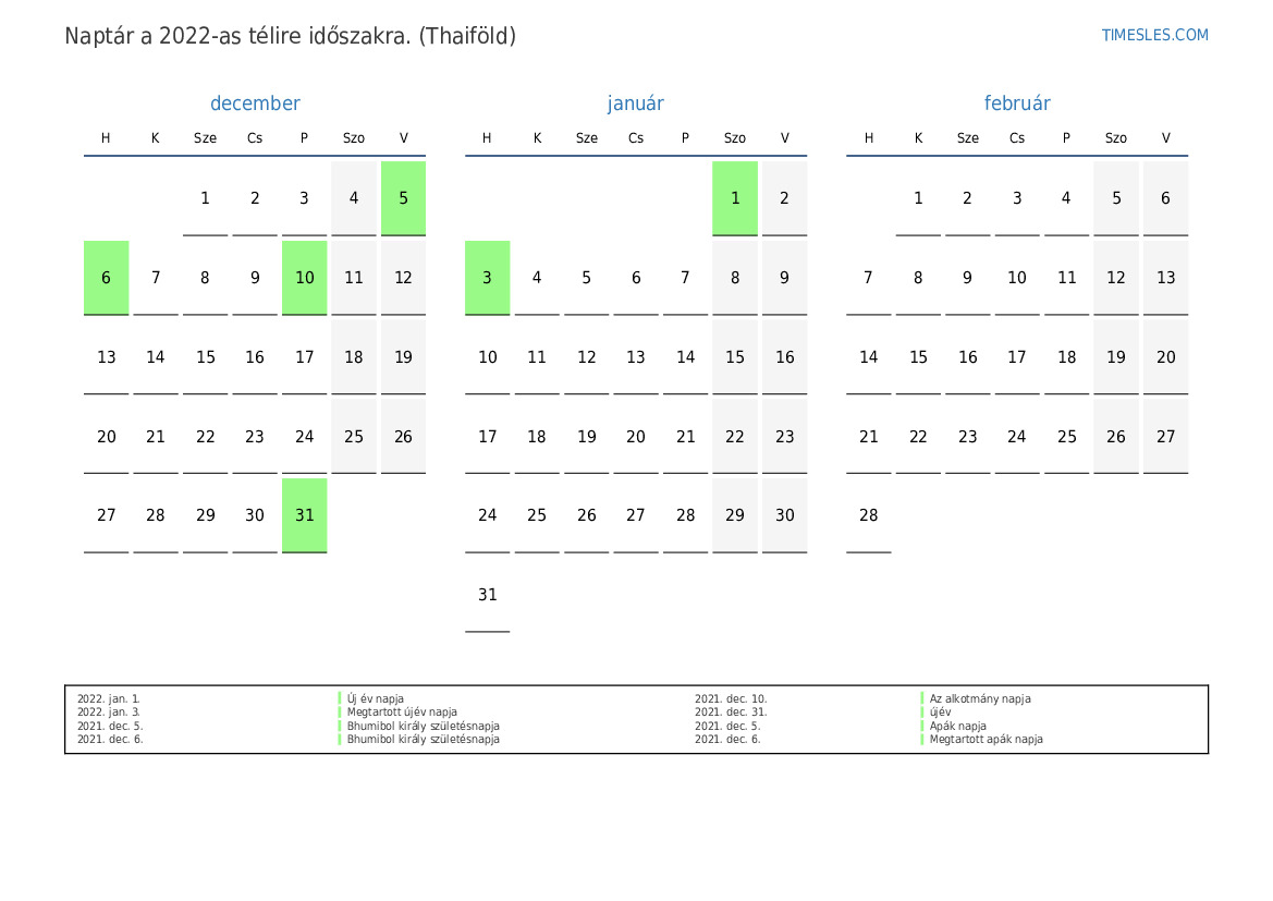 Ünnepnapok és hétvégék 2022 őszre Thaiföld számára