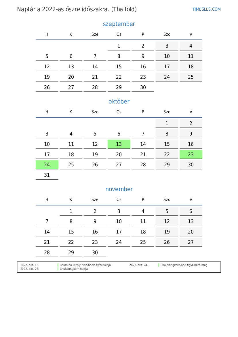 Töltse le és nyomtassa ki az ünnepnapokkal és hétvégékkel ellátott PDF naptárat Thaiföld számára 2022 őszre