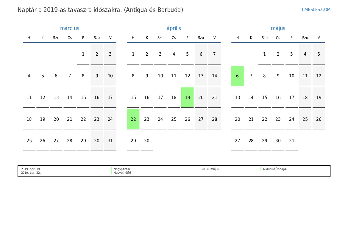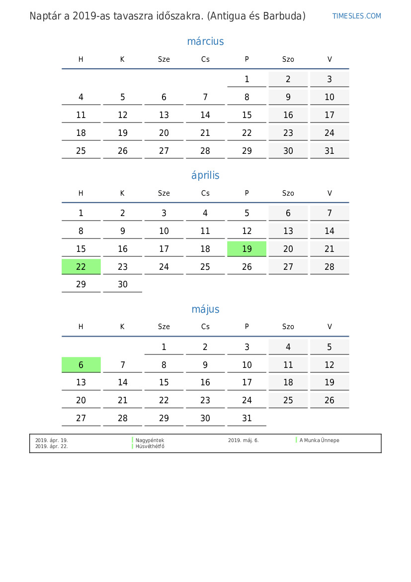 Töltse le és nyomtassa ki az ünnepnapokkal és hétvégékkel ellátott PDF naptárat Antigua és Barbuda számára 2019 tavaszra