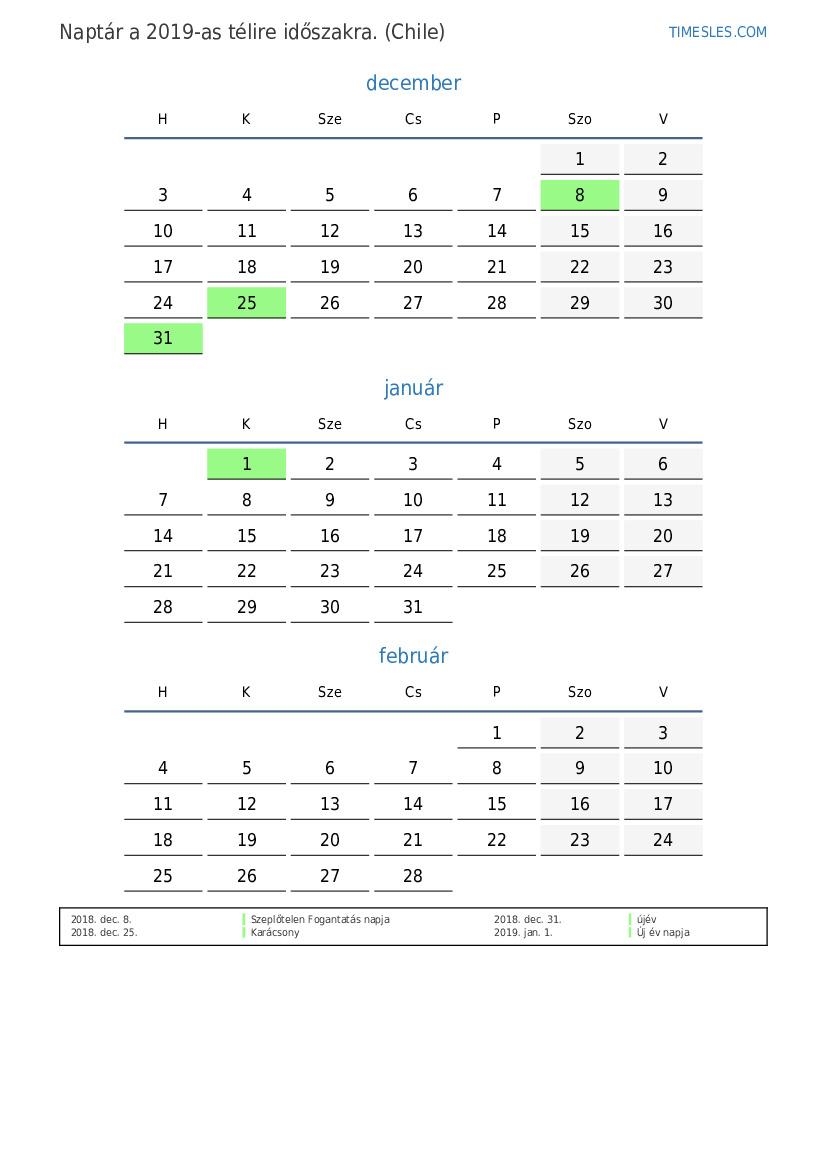 Ünnepnapok és hétvégék 2019 tavaszra Chile számára