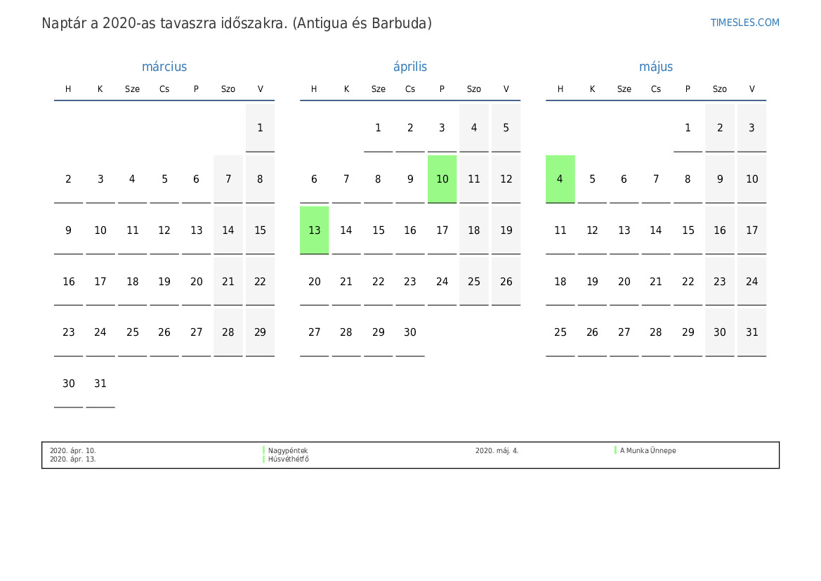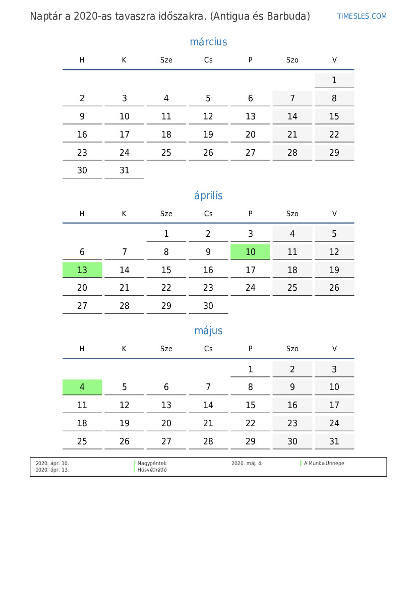 Töltse le és nyomtassa ki az ünnepnapokkal és hétvégékkel ellátott PDF naptárat Antigua és Barbuda számára 2020 tavaszra