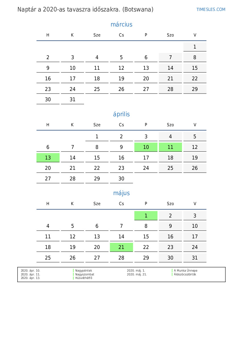 Töltse le és nyomtassa ki az ünnepnapokkal és hétvégékkel ellátott PDF naptárat Botswanának 2020 tavaszra