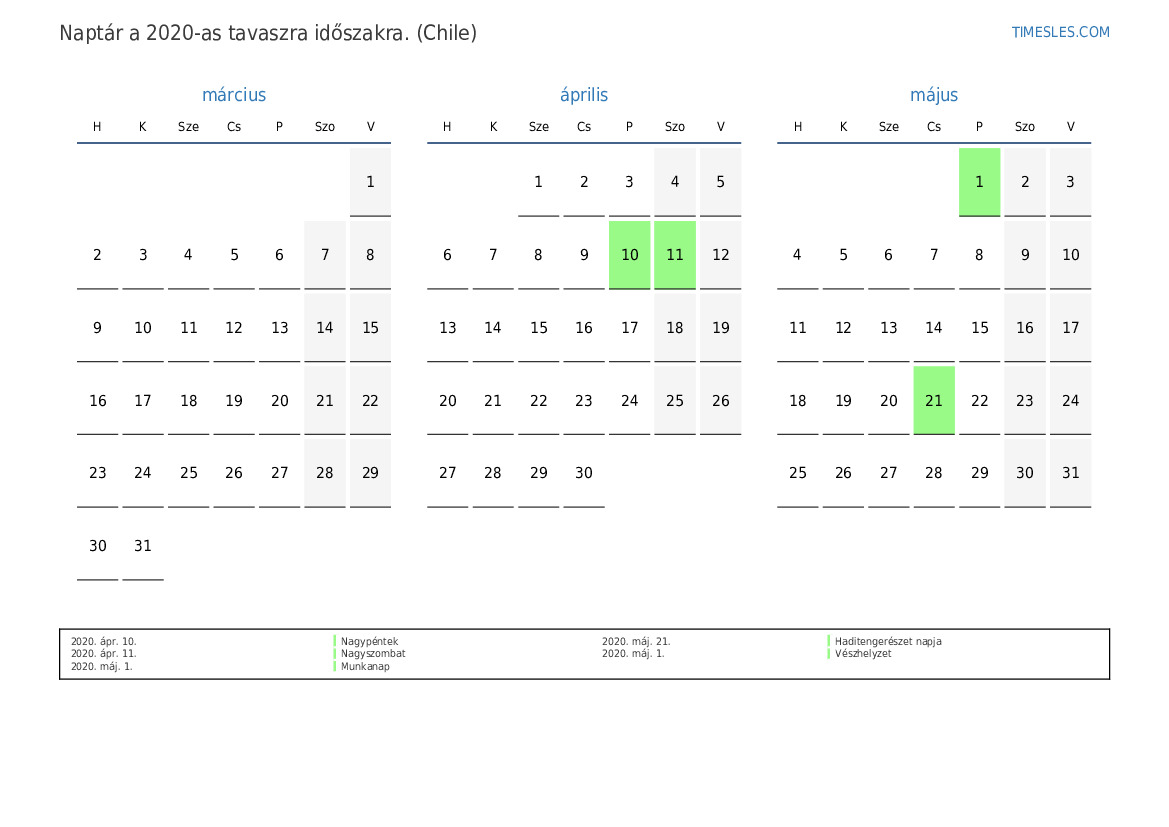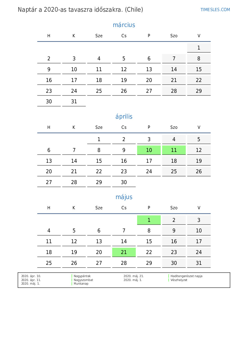 Töltse le és nyomtassa ki az ünnepnapokkal és hétvégékkel ellátott PDF naptárat Chile számára 2020 tavaszra
