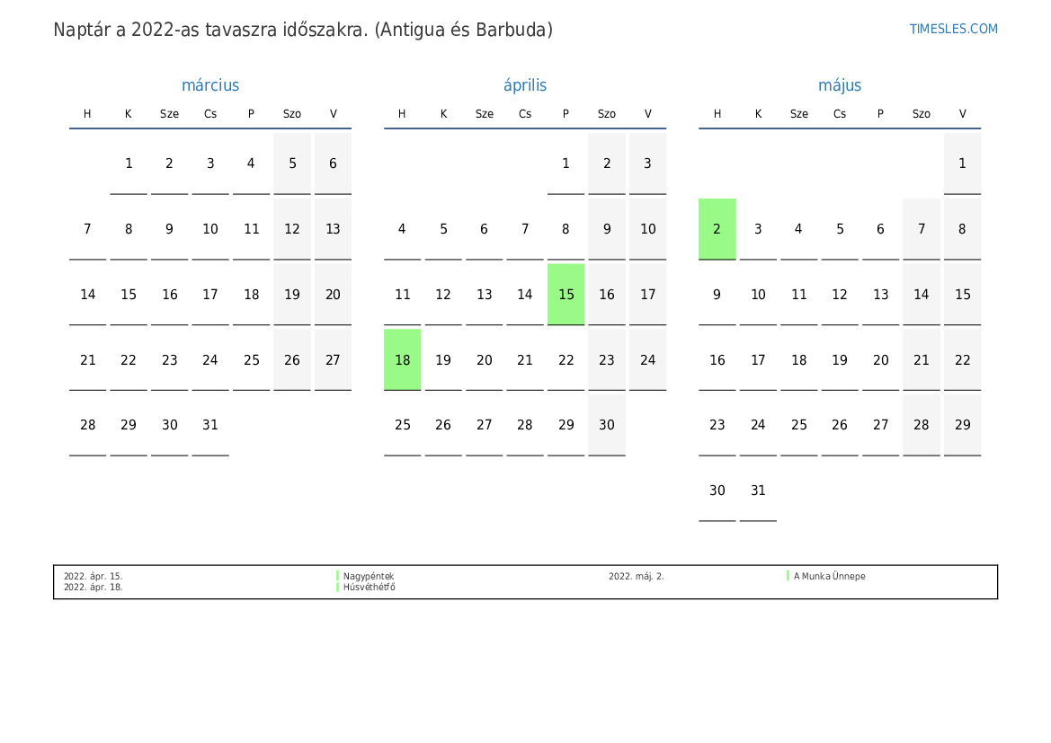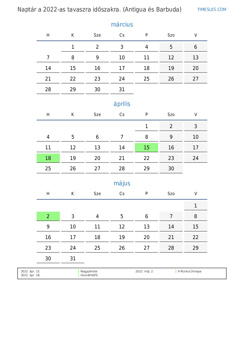 2022-es tavaszra naptár Antigua és Barbuda számára