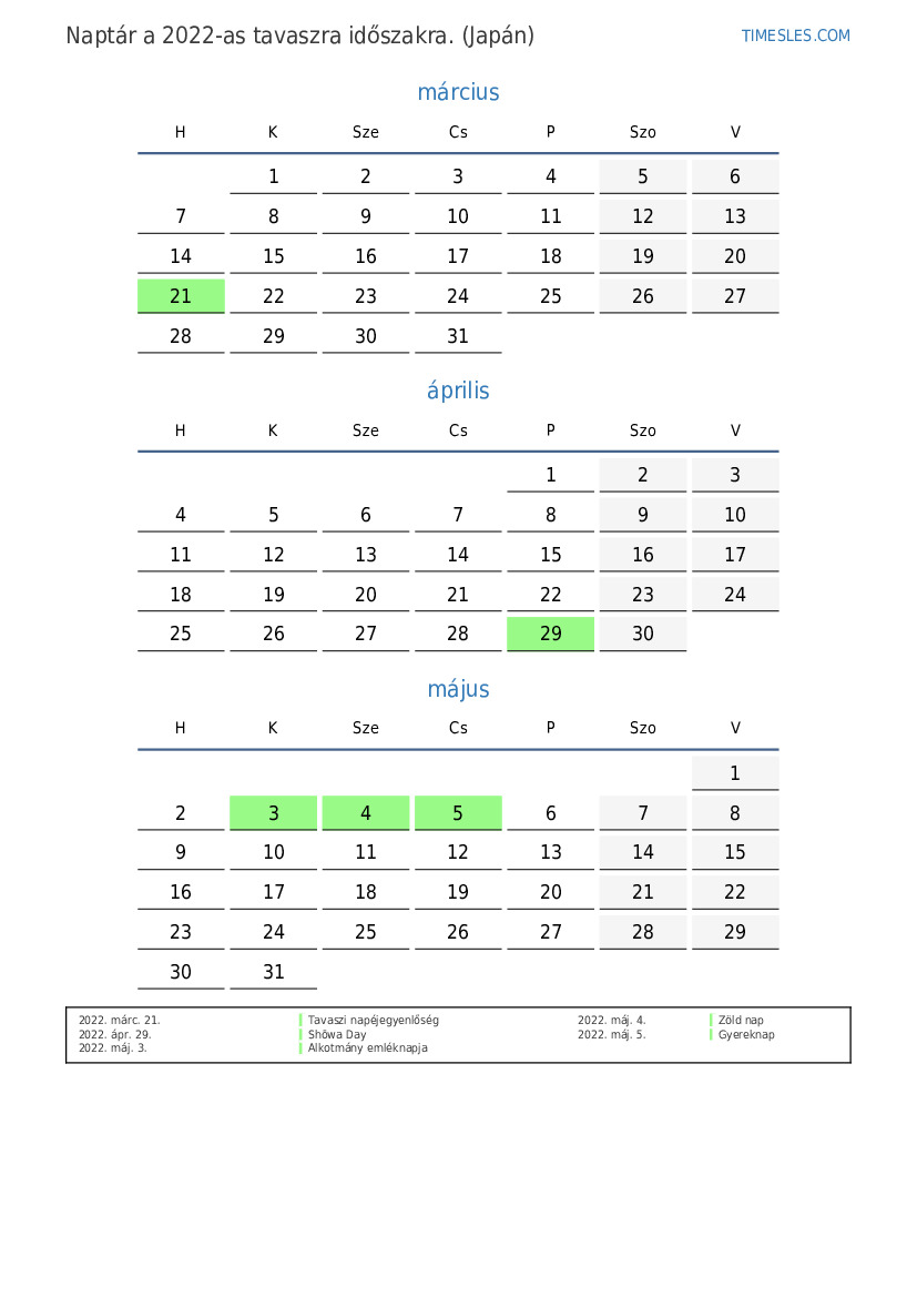 2022-es tavaszra naptár Japán számára