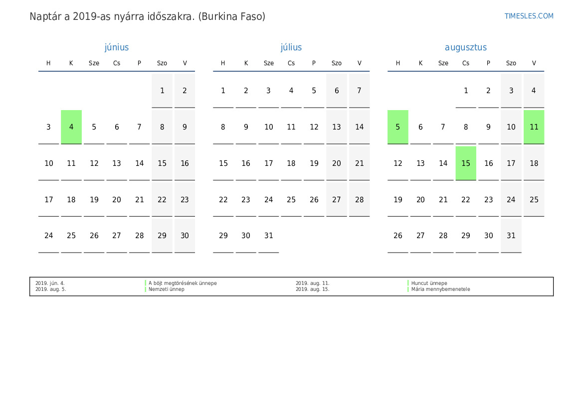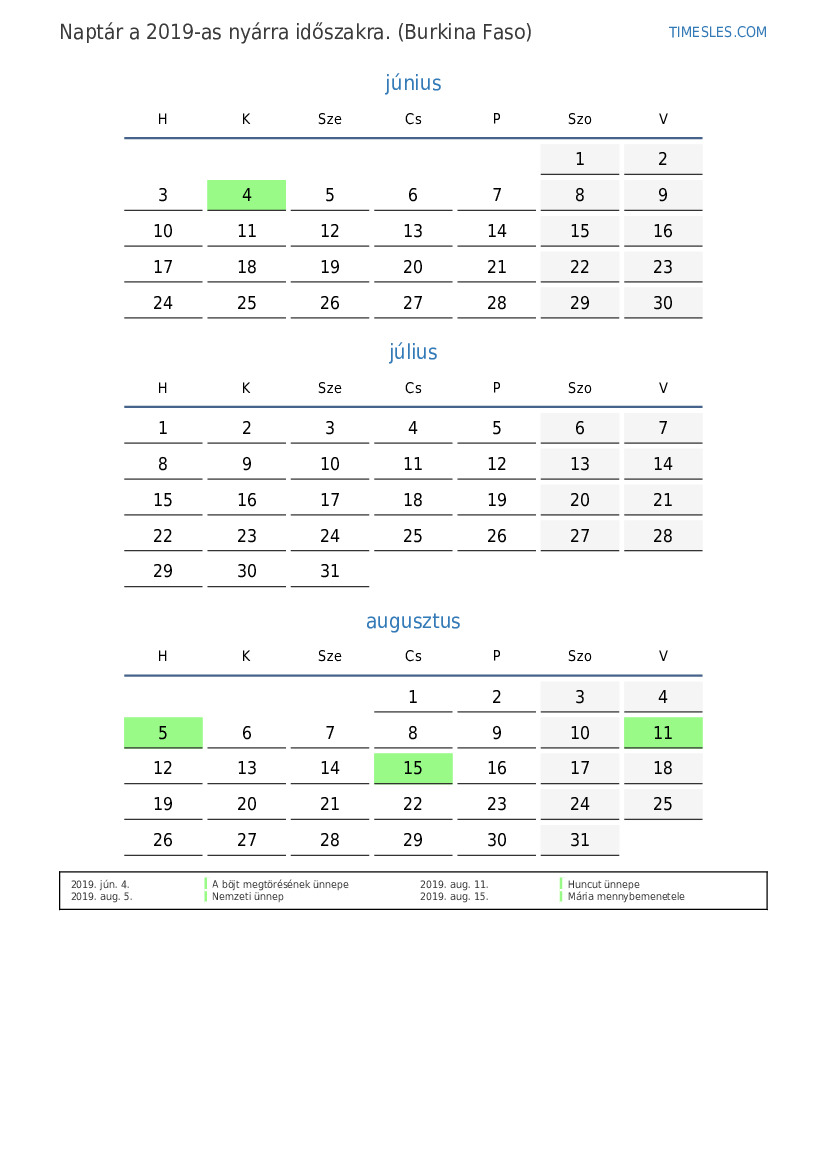 Töltse le és nyomtassa ki az ünnepnapokkal és hétvégékkel ellátott PDF naptárat Burkina Faso számára 2019 nyárra