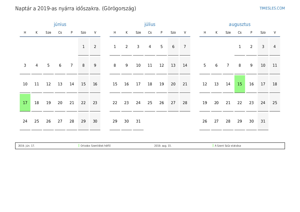 Töltse le és nyomtassa ki az ünnepnapokkal és hétvégékkel ellátott PDF naptárat Görögország számára 2019 nyárra