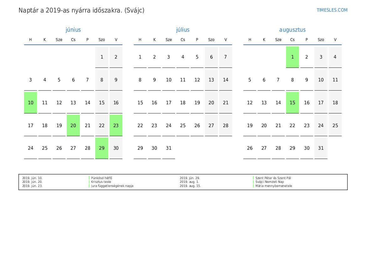 2019 Nyáron 8 ünnep és szabadnap van Svájcban. A 2019. Nyár szombaton kezdődik és szombaton ér véget.