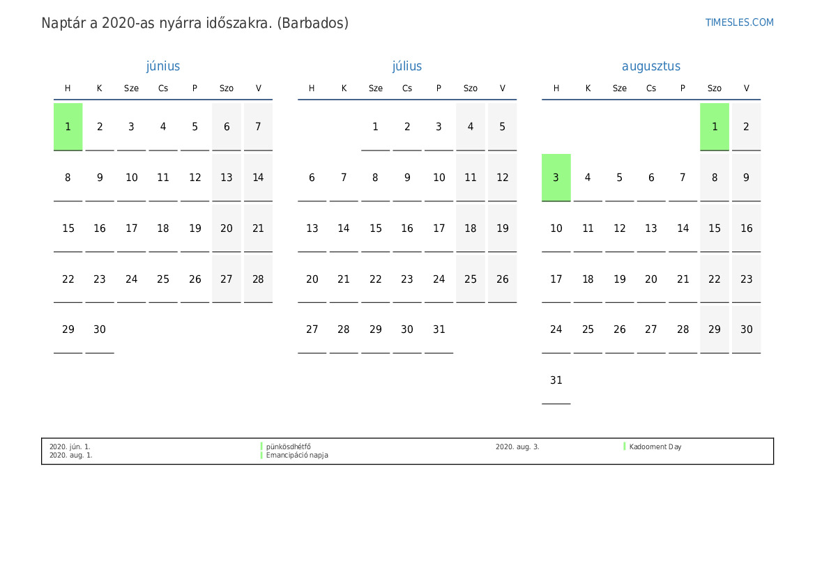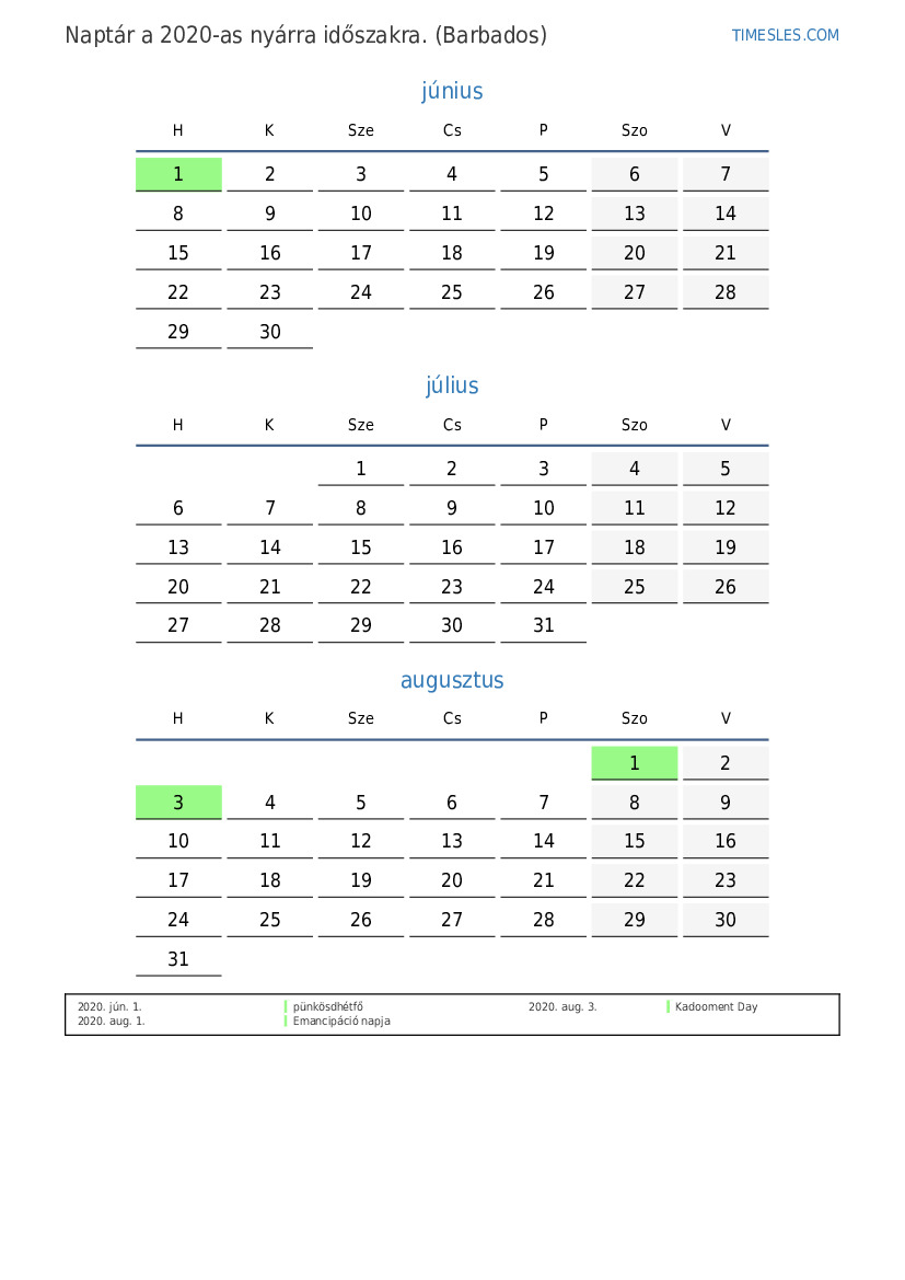 Töltse le és nyomtassa ki az ünnepnapokkal és hétvégékkel ellátott PDF naptárat Barbados számára 2020 nyárra
