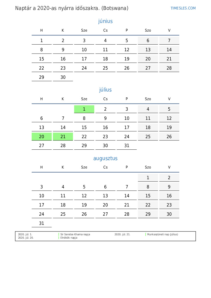 Töltse le és nyomtassa ki az ünnepnapokkal és hétvégékkel ellátott PDF naptárat Botswanának 2020 nyárra