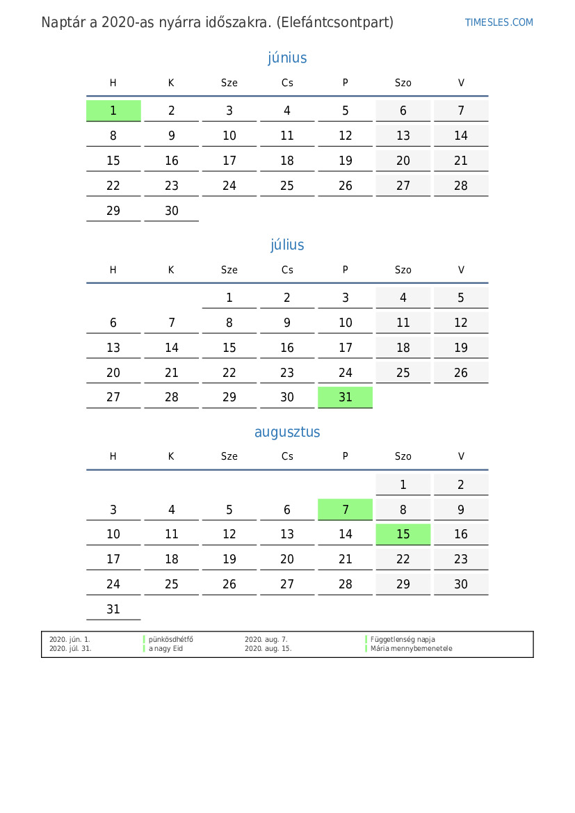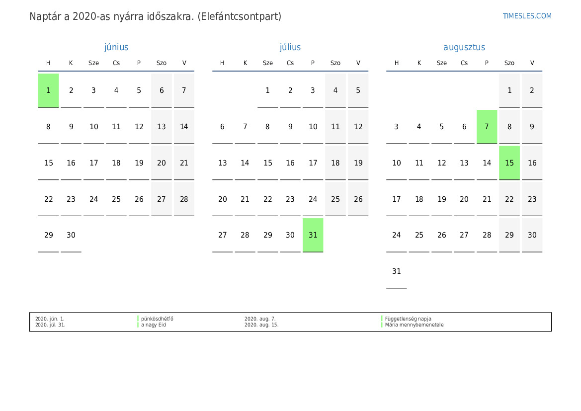 Töltse le és nyomtassa ki az ünnepnapokkal és hétvégékkel ellátott PDF naptárat Elefántcsontpart számára 2020 nyárra