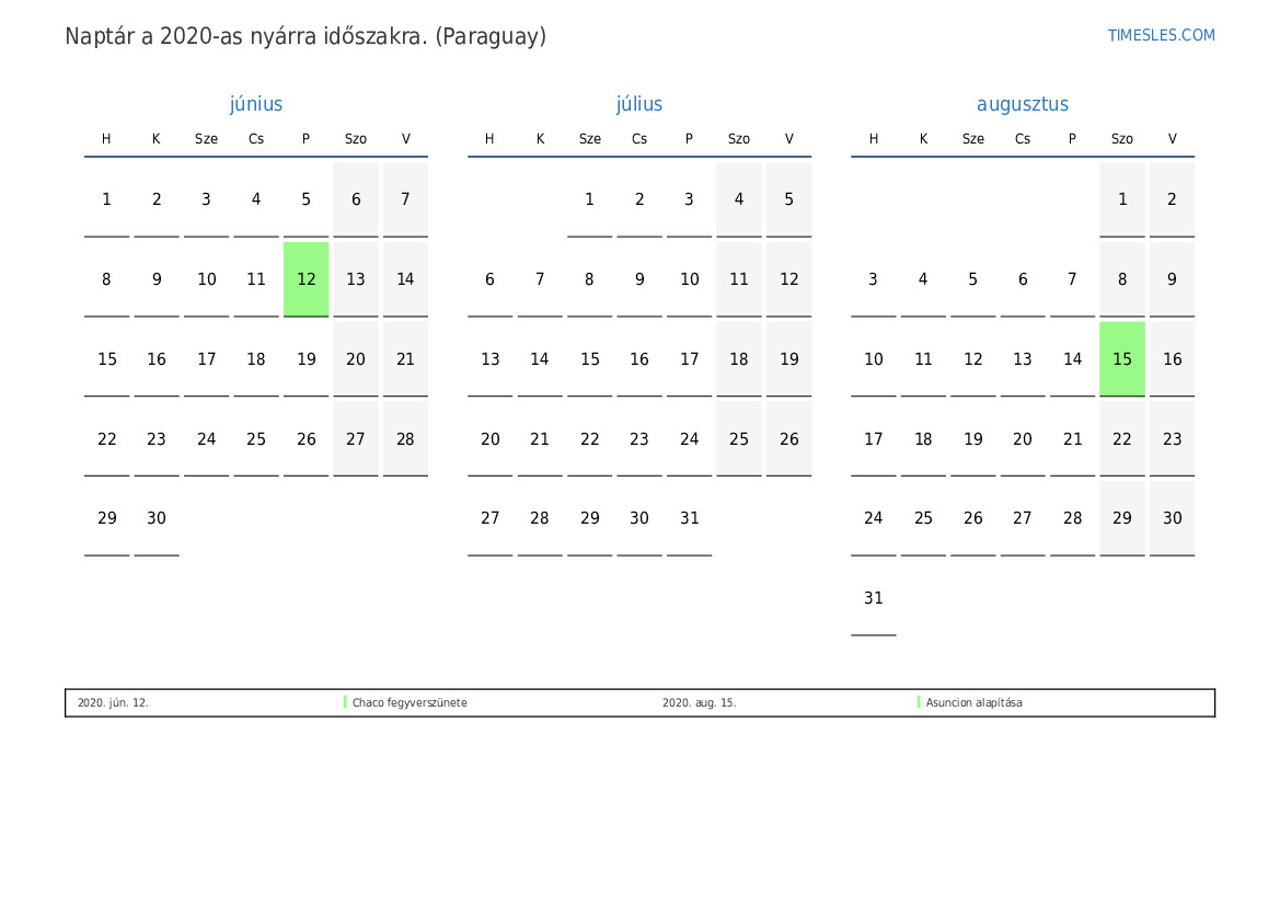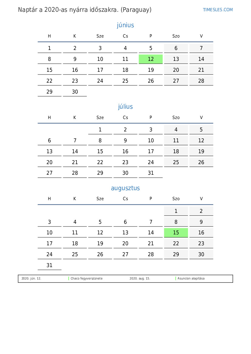 Töltse le és nyomtassa ki az ünnepnapokkal és hétvégékkel ellátott PDF naptárat Paraguayért 2020 nyárra