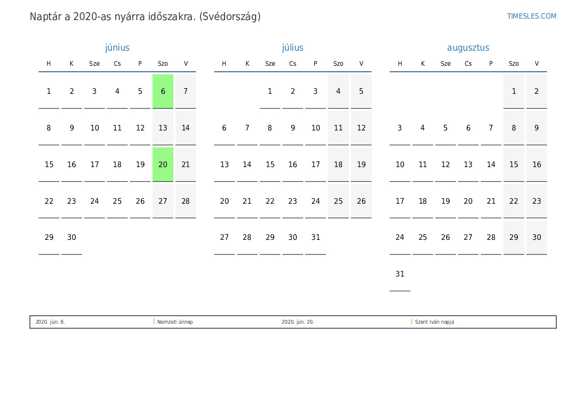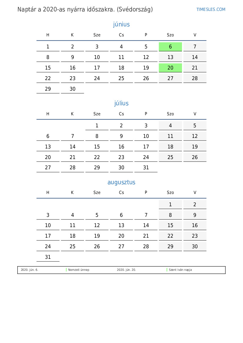 Töltse le és nyomtassa ki az ünnepnapokkal és hétvégékkel ellátott PDF naptárat Svédország számára 2020 nyárra