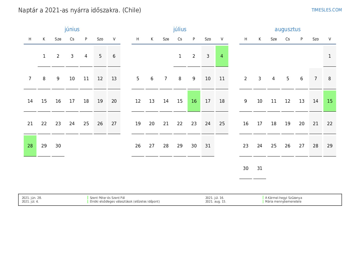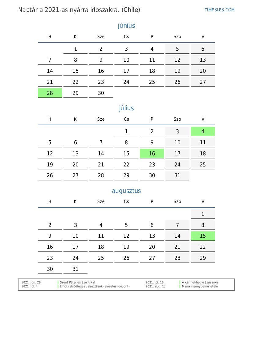 Ünnepnapok és hétvégék 2021 nyárra Chile számára