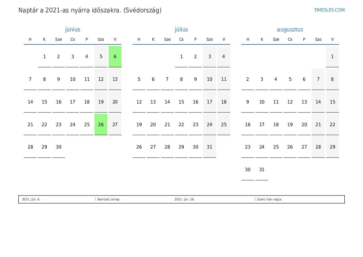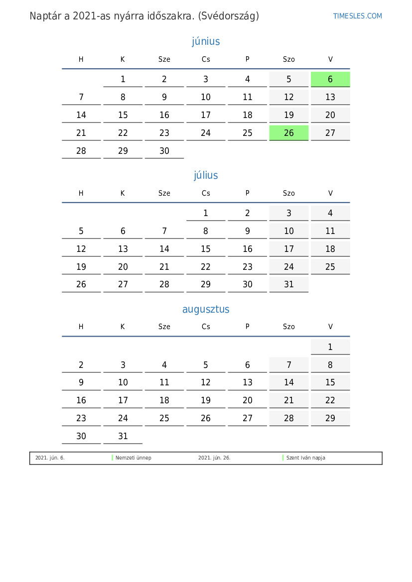 Töltse le és nyomtassa ki az ünnepnapokkal és hétvégékkel ellátott PDF naptárat Svédország számára 2021 nyárra
