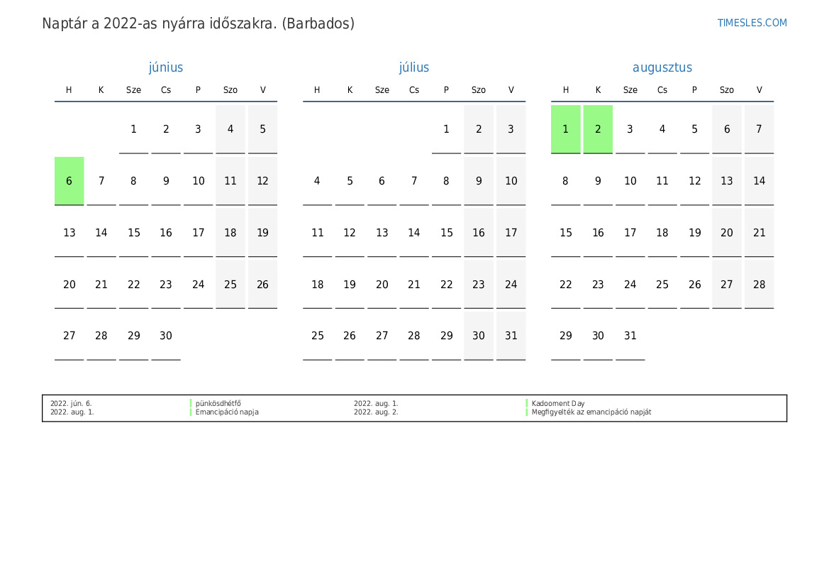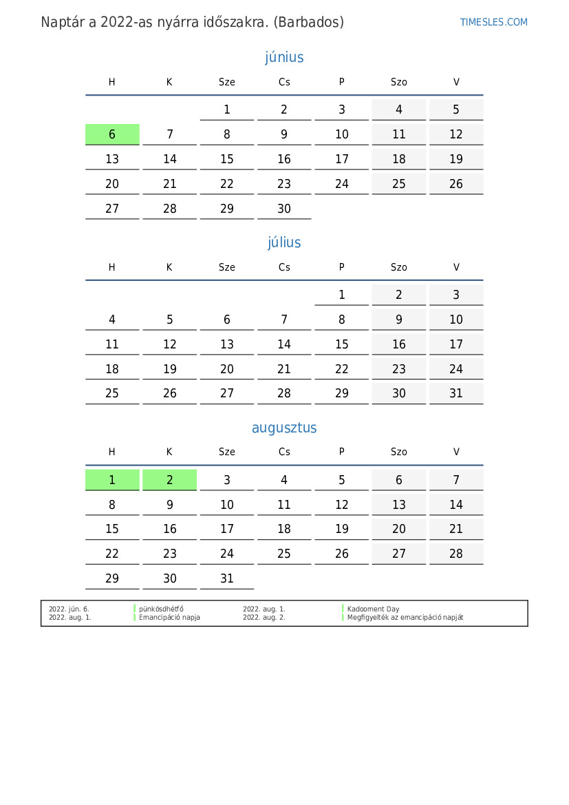Töltse le és nyomtassa ki az ünnepnapokkal és hétvégékkel ellátott PDF naptárat Barbados számára 2022 nyárra