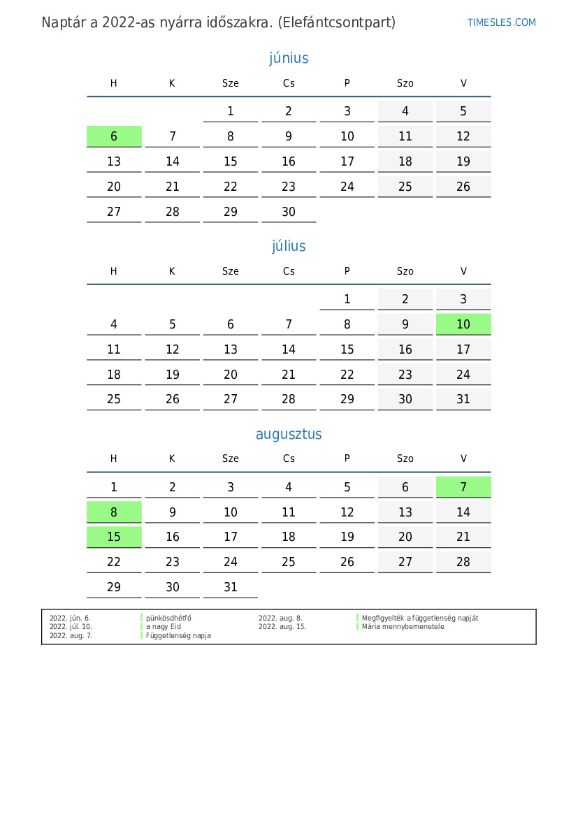 2022-es nyárra naptár Elefántcsontpart számára