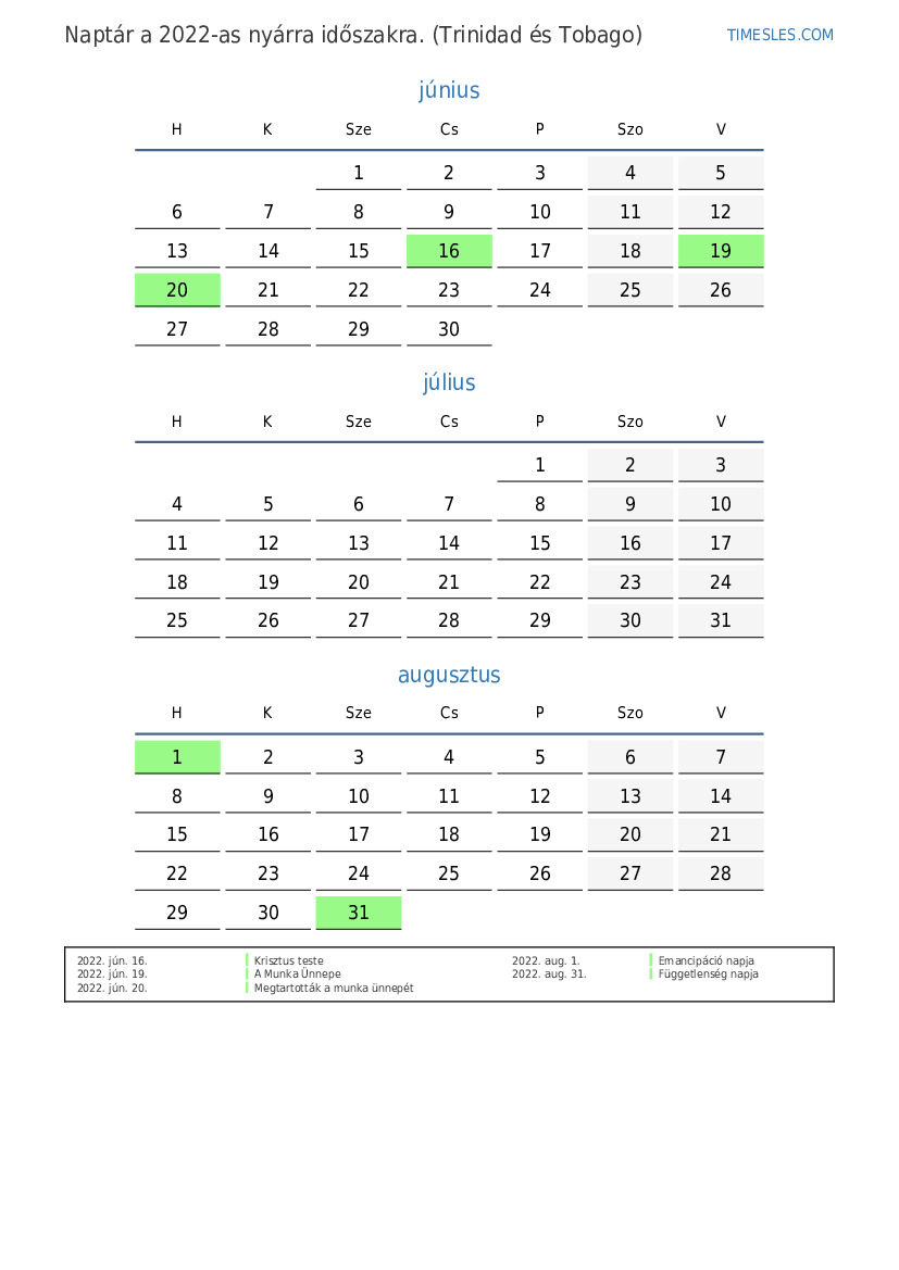 Töltse le és nyomtassa ki az ünnepnapokkal és hétvégékkel ellátott PDF naptárat Trinidad és Tobago számára 2022 nyárra
