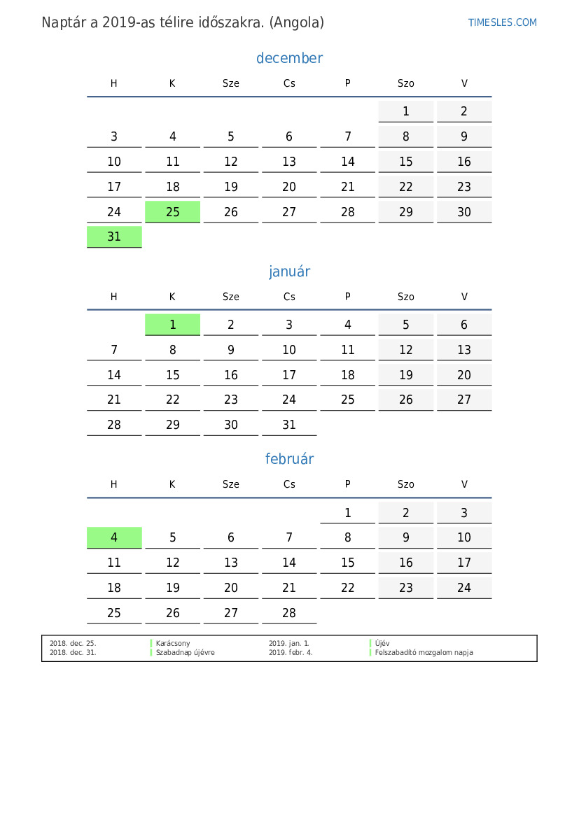 Töltse le és nyomtassa ki az ünnepnapokkal és hétvégékkel ellátott PDF naptárat Angolának 2019 télire