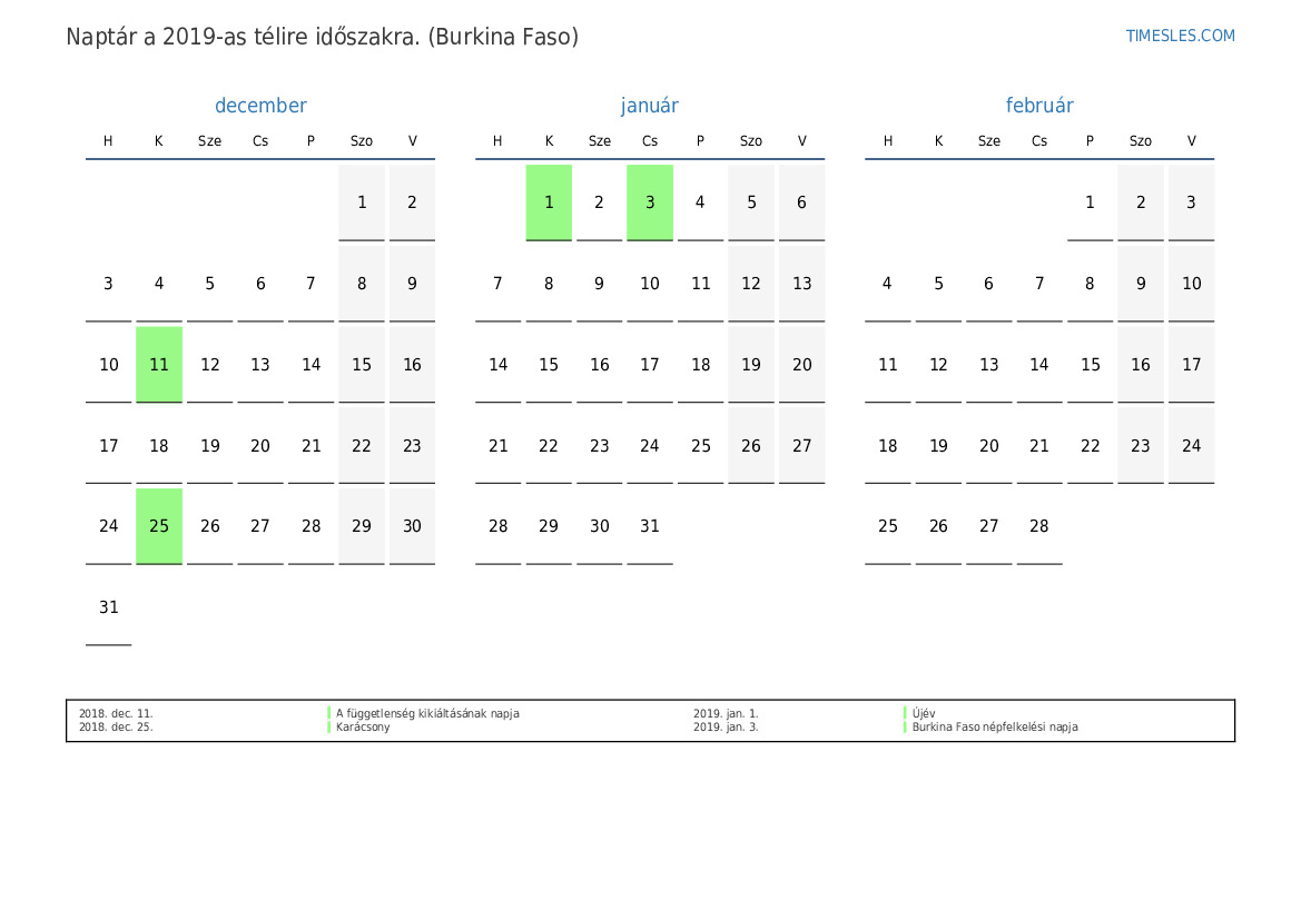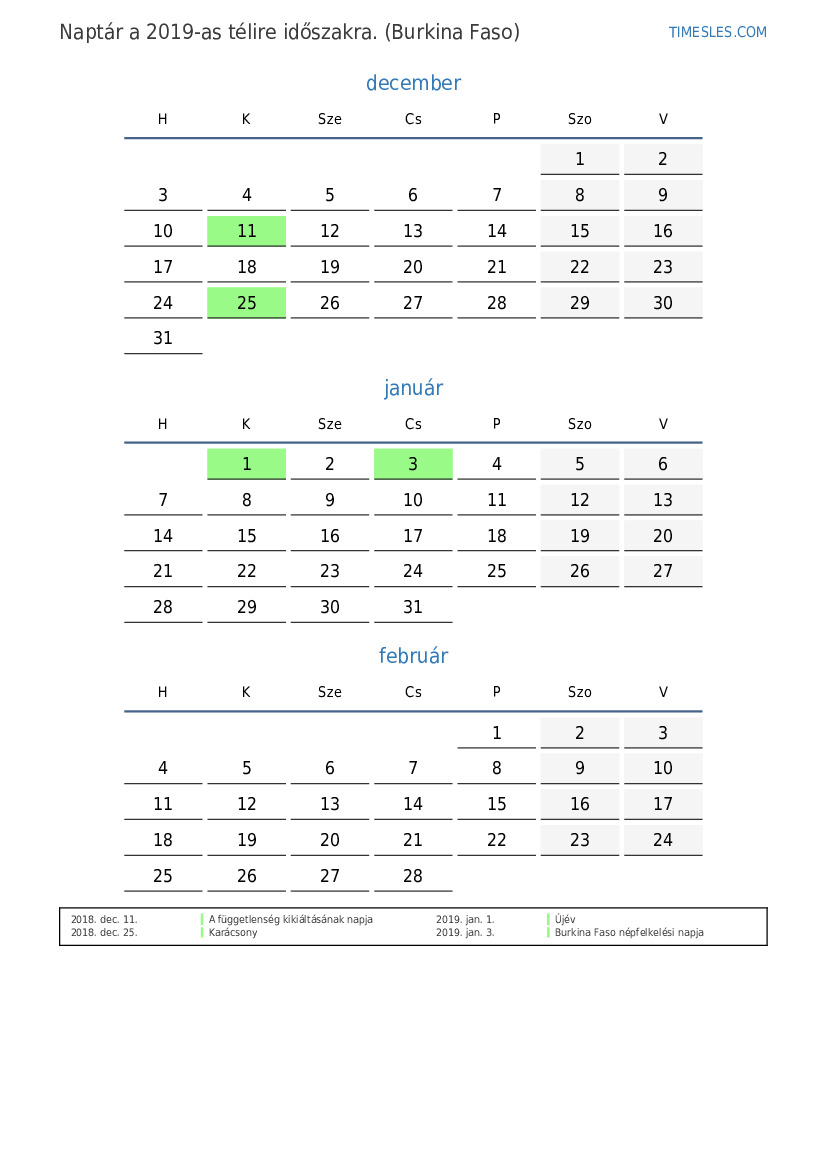 Töltse le és nyomtassa ki az ünnepnapokkal és hétvégékkel ellátott PDF naptárat Burkina Faso számára 2019 télire