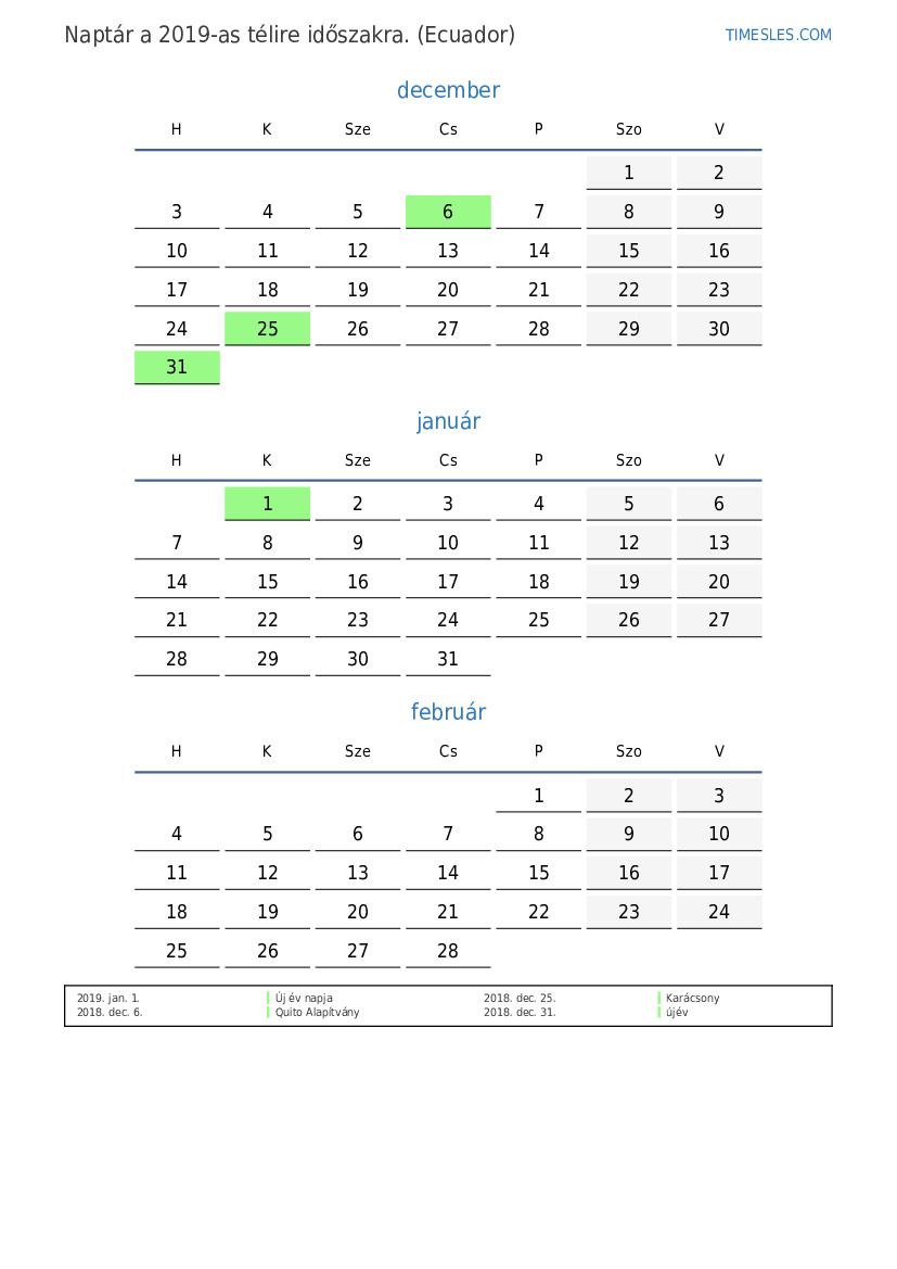 Töltse le és nyomtassa ki az ünnepnapokkal és hétvégékkel ellátott PDF naptárat Ecuadorért 2019 télire