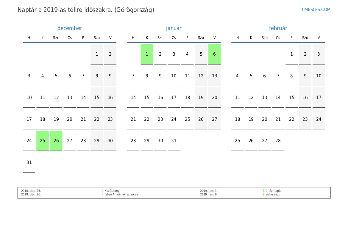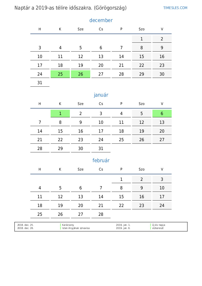 Töltse le és nyomtassa ki az ünnepnapokkal és hétvégékkel ellátott PDF naptárat Görögország számára 2019 télire