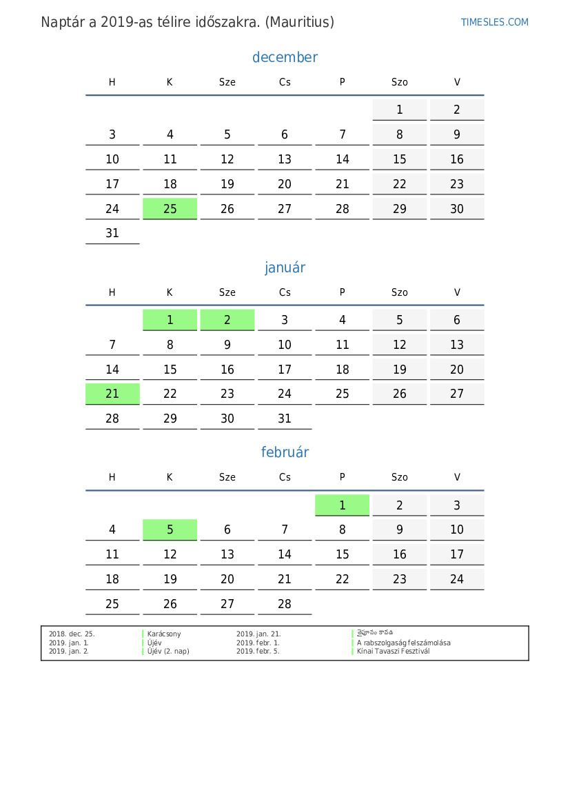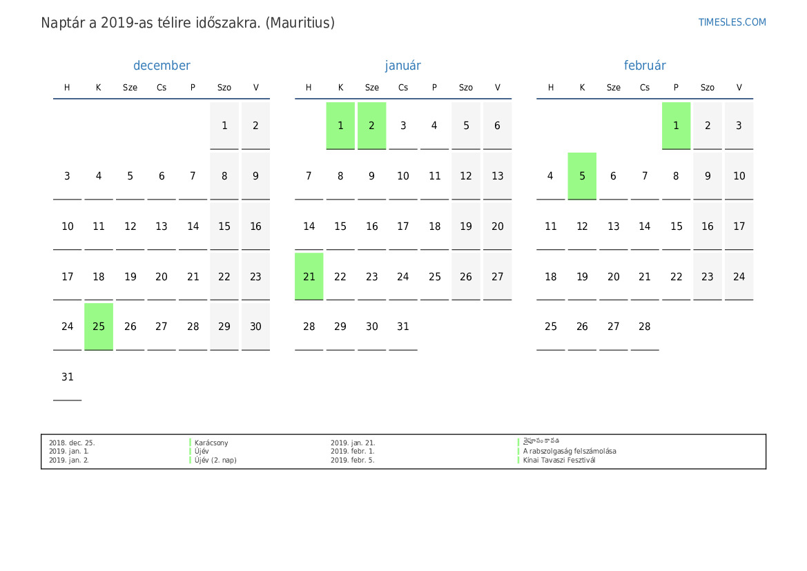 Töltse le és nyomtassa ki az ünnepnapokkal és hétvégékkel ellátott PDF naptárat Mauritius számára 2019 télire