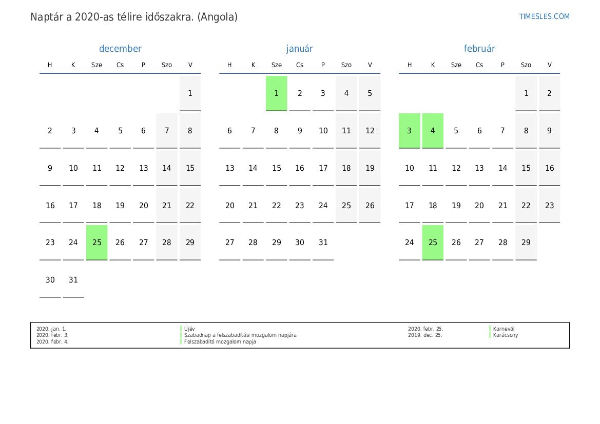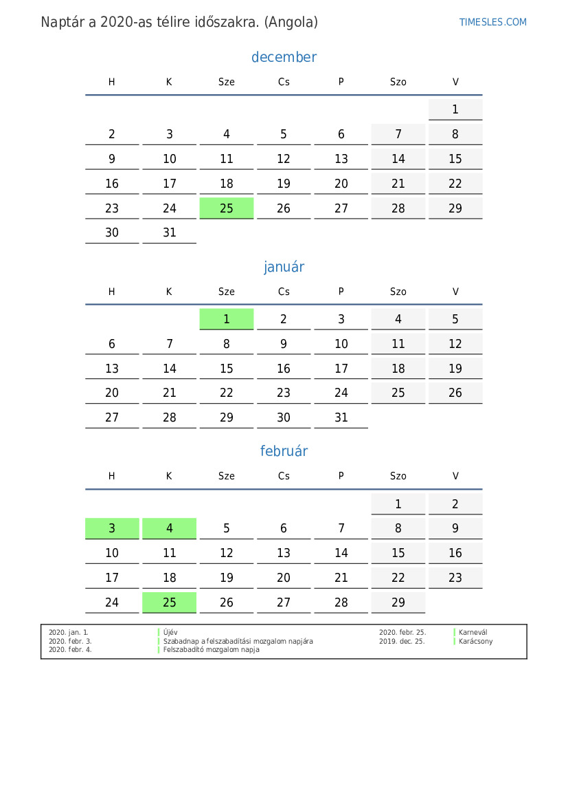 Töltse le és nyomtassa ki az ünnepnapokkal és hétvégékkel ellátott PDF naptárat Angolának 2020 télire