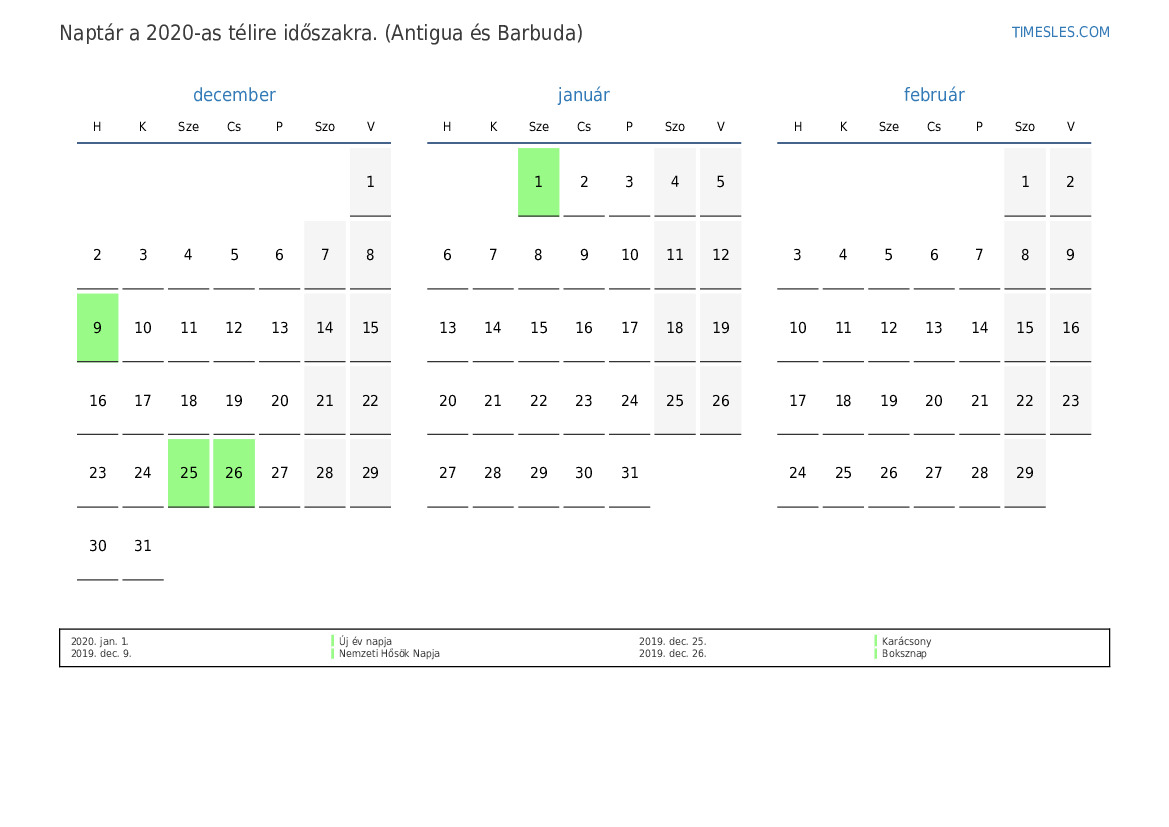 Töltse le és nyomtassa ki az ünnepnapokkal és hétvégékkel ellátott PDF naptárat Antigua és Barbuda számára 2020 télire