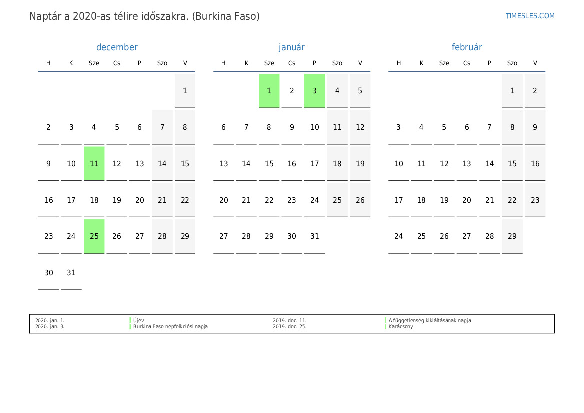 Töltse le és nyomtassa ki az ünnepnapokkal és hétvégékkel ellátott PDF naptárat Burkina Faso számára 2020 télire