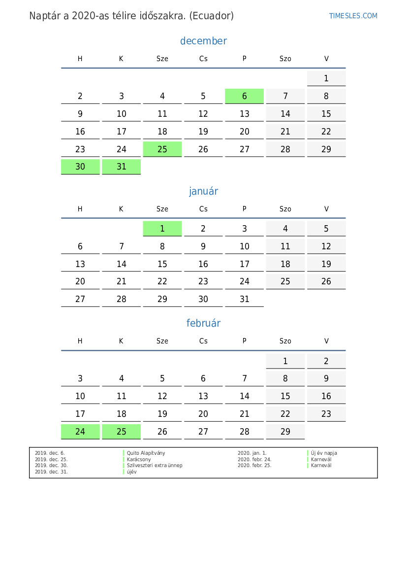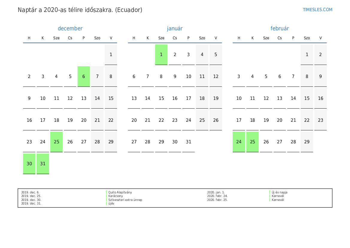 Töltse le és nyomtassa ki az ünnepnapokkal és hétvégékkel ellátott PDF naptárat Ecuadorért 2020 télire