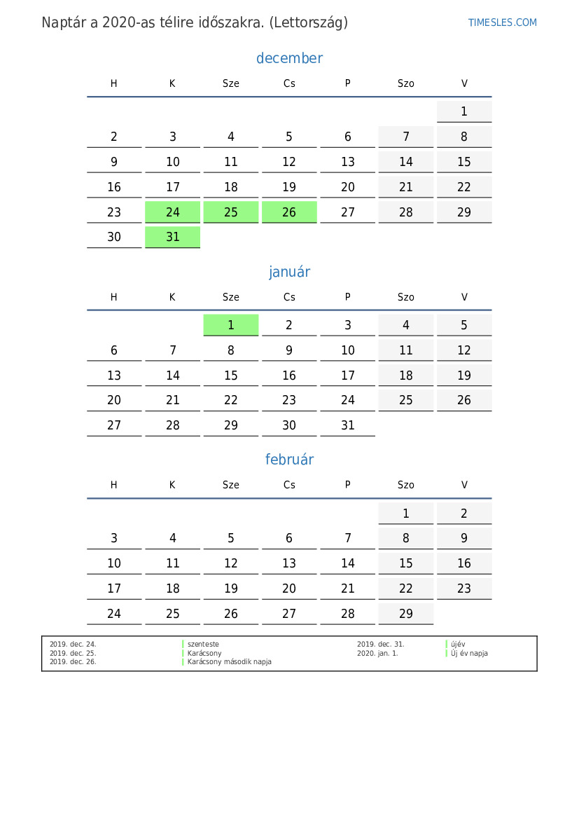 Töltse le és nyomtassa ki az ünnepnapokkal és hétvégékkel ellátott PDF naptárat Lettország számára 2020 télire