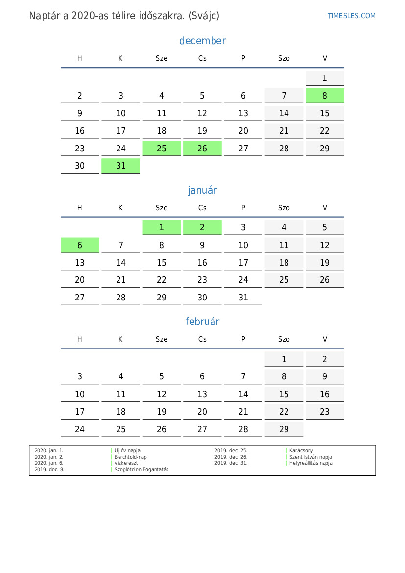 2020 Télen 11 ünnep és szabadnap van Svájcban. A 2020. Téli vasárnap kezdődik és szombaton ér véget.