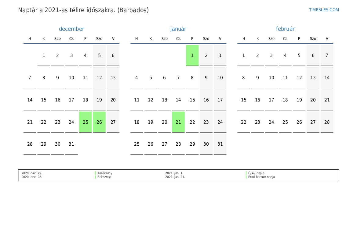 Töltse le és nyomtassa ki az ünnepnapokkal és hétvégékkel ellátott PDF naptárat Barbados számára 2021 télire