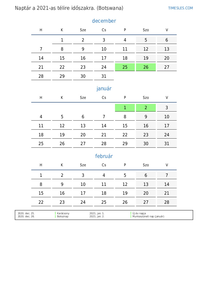 Töltse le és nyomtassa ki az ünnepnapokkal és hétvégékkel ellátott PDF naptárat Botswanának 2021 télire