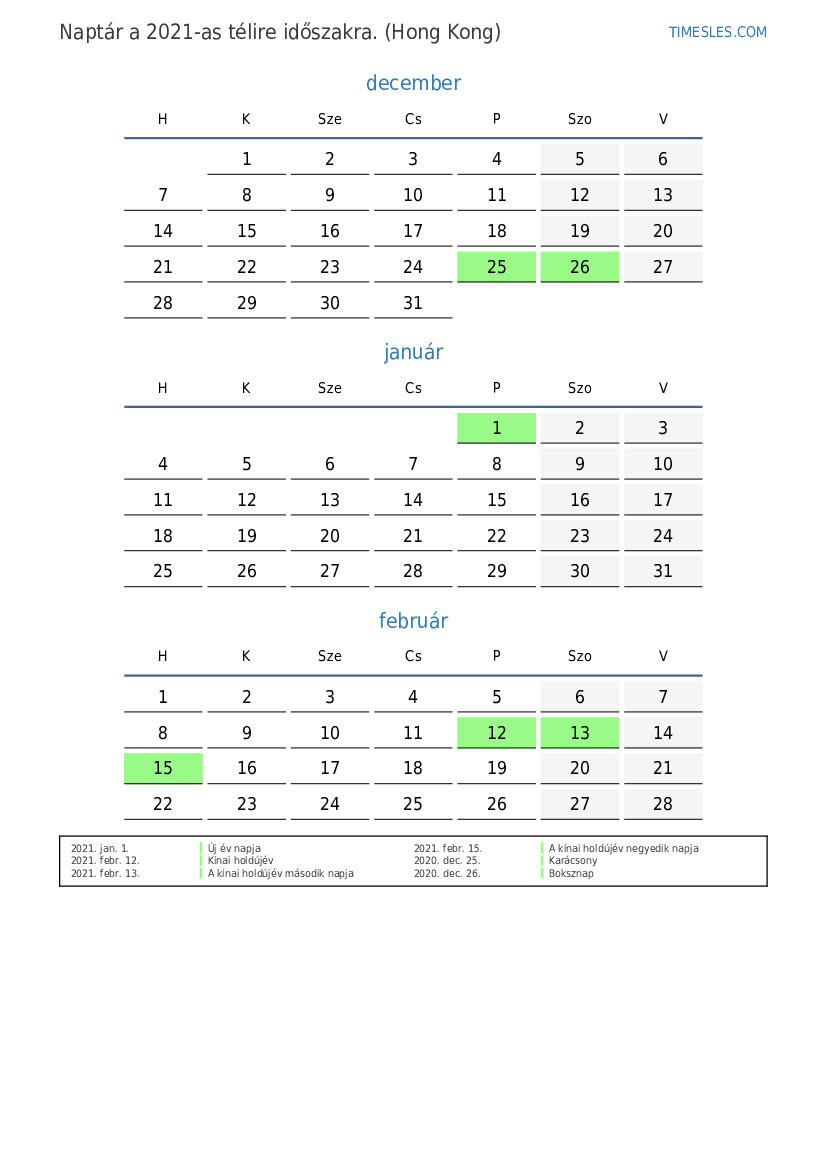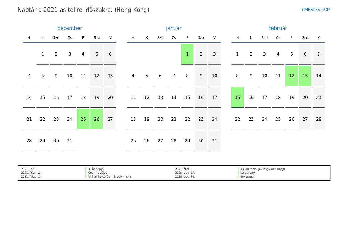 Töltse le és nyomtassa ki az ünnepnapokkal és hétvégékkel ellátott PDF naptárat Hong Kong számára 2021 télire
