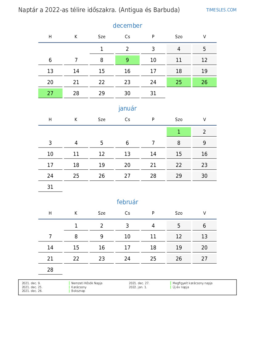 Töltse le és nyomtassa ki az ünnepnapokkal és hétvégékkel ellátott PDF naptárat Antigua és Barbuda számára 2022 télire