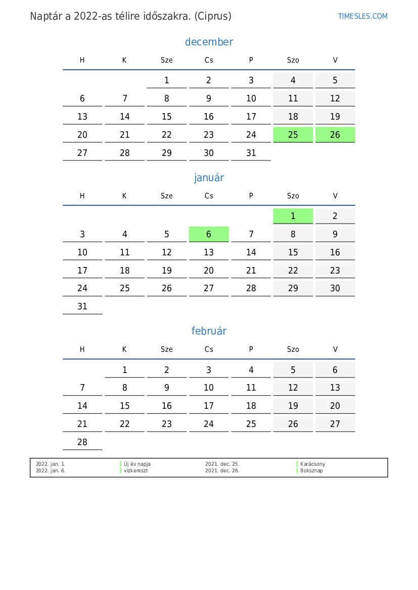 Töltse le és nyomtassa ki az ünnepnapokkal és hétvégékkel ellátott PDF naptárat Ciprus számára 2022 télire