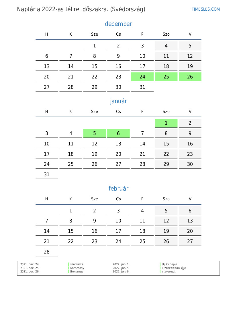 Töltse le és nyomtassa ki az ünnepnapokkal és hétvégékkel ellátott PDF naptárat Svédország számára 2022 télire