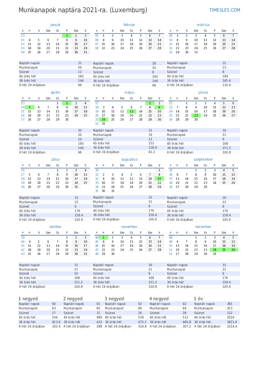 Munkanapok 2021 május. Luxemburgban 6 ünnep és szabadnap van 2021 május.