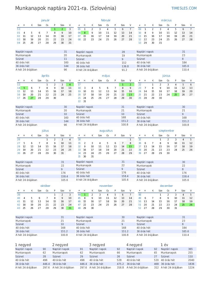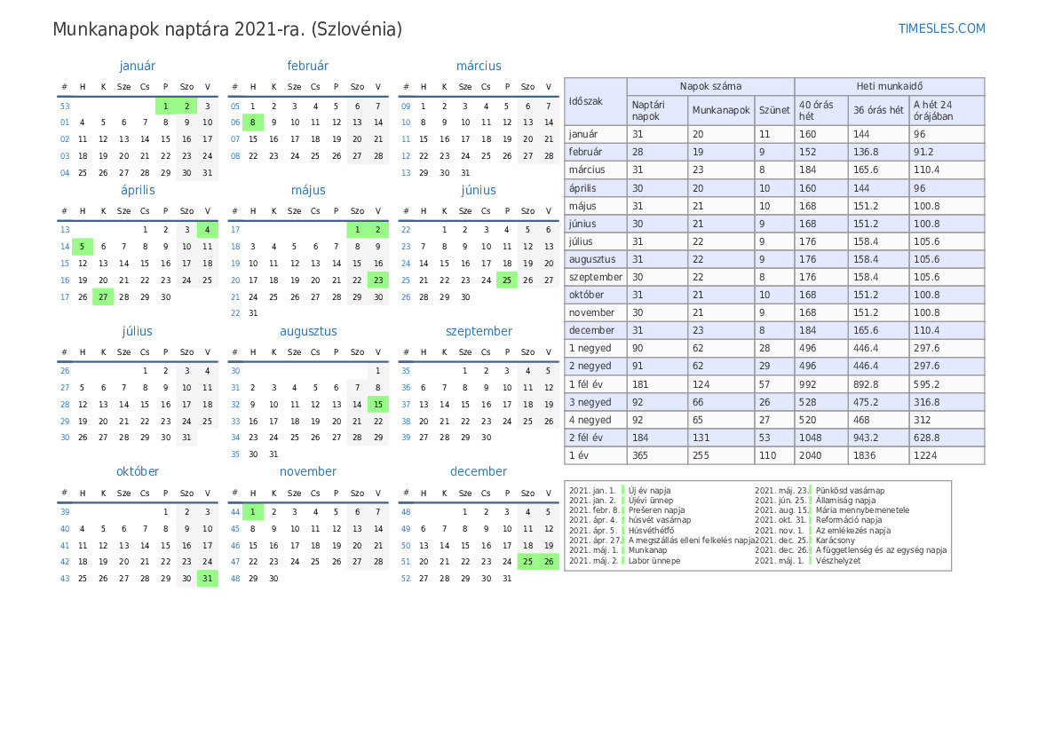 Munkanapok 2021 július Szlovénia számára