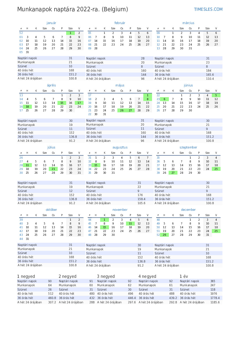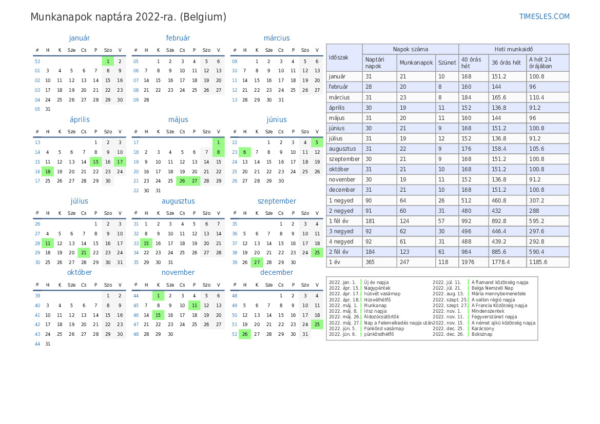 Munkanapok 2022 április. Belgiumban 3 ünnep és szabadnap van 2022 április.
