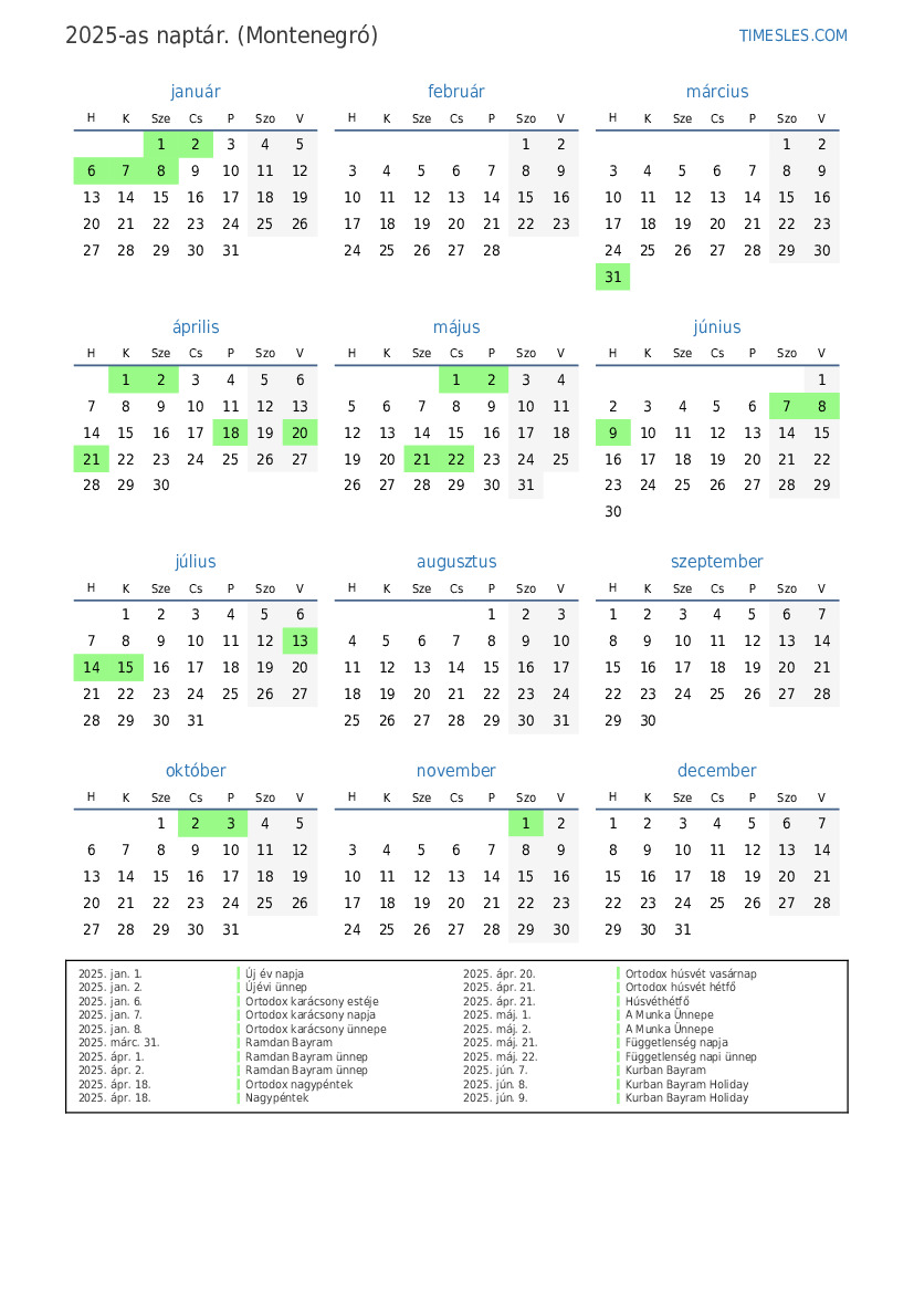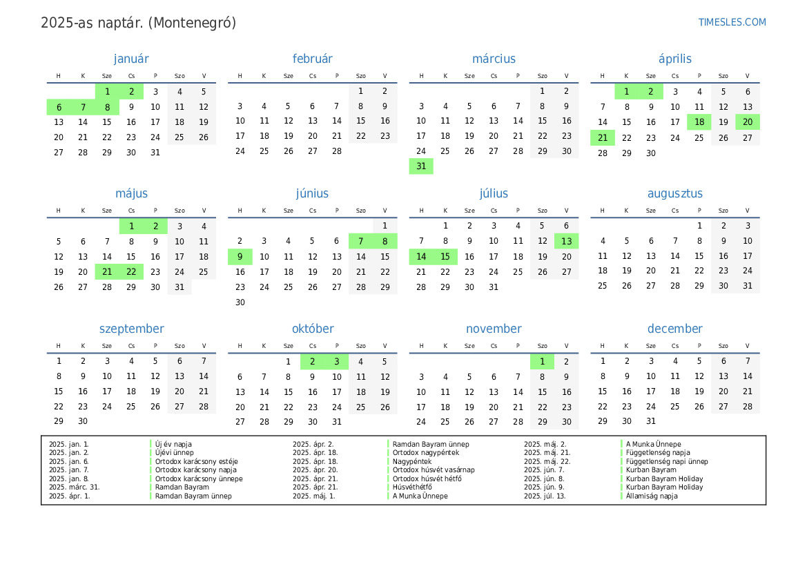 PDF naptár letöltése és kinyomtatása ünnepekkel és hétvégékkel 2025-ra Montenegró számára