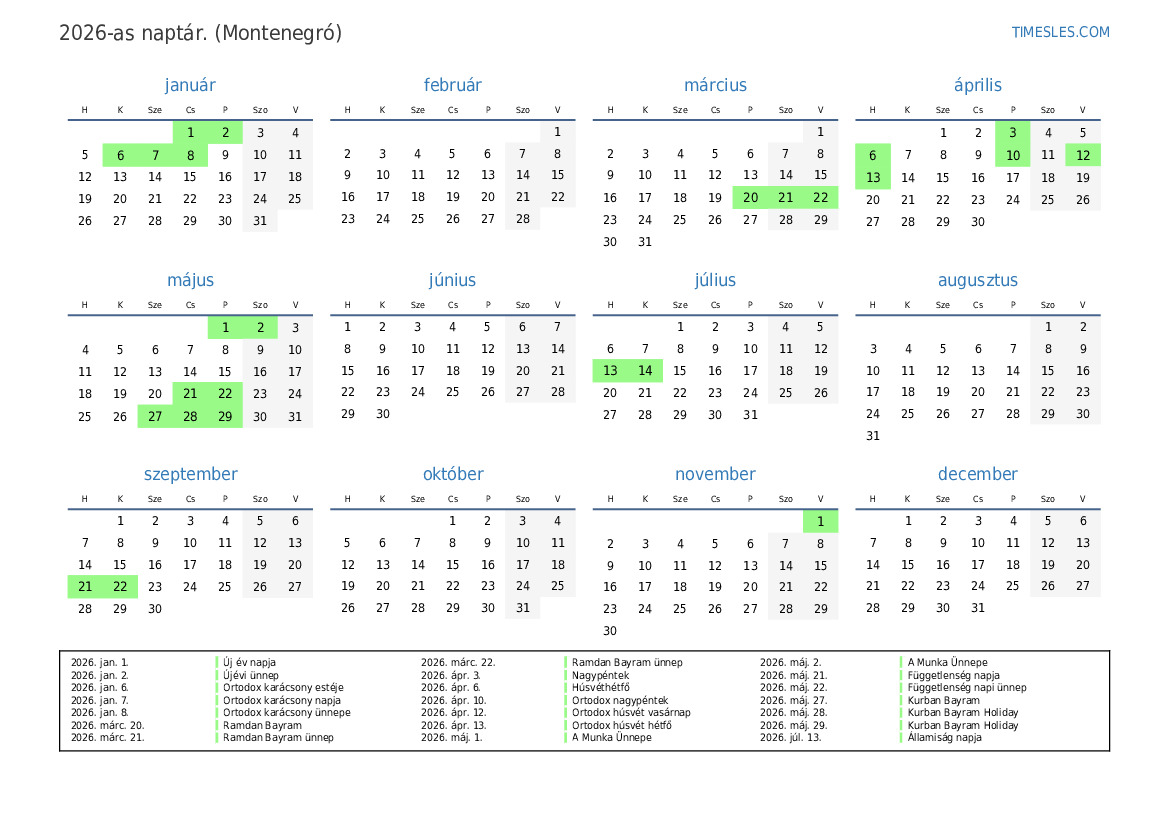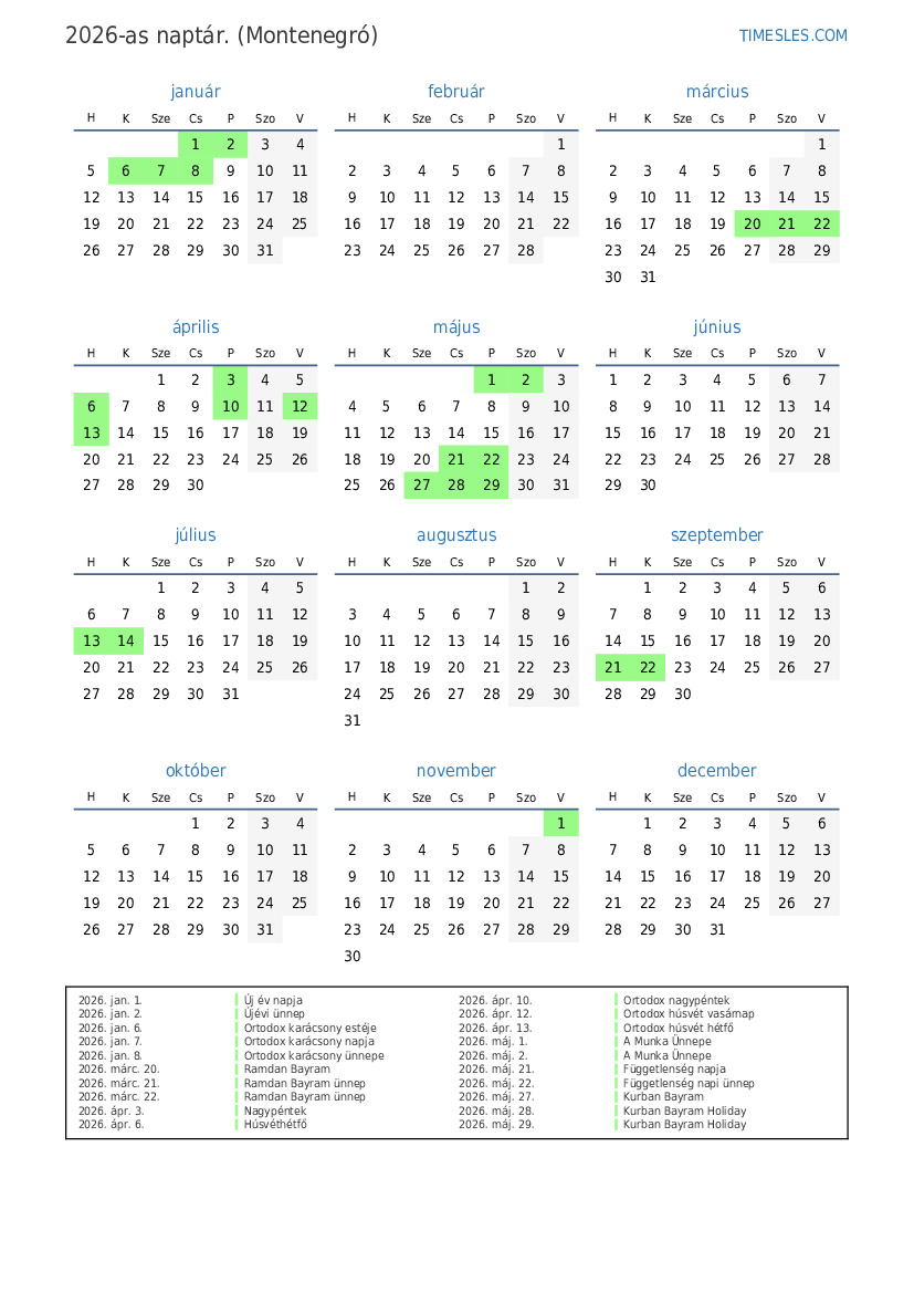 2026-es naptár Montenegró számára