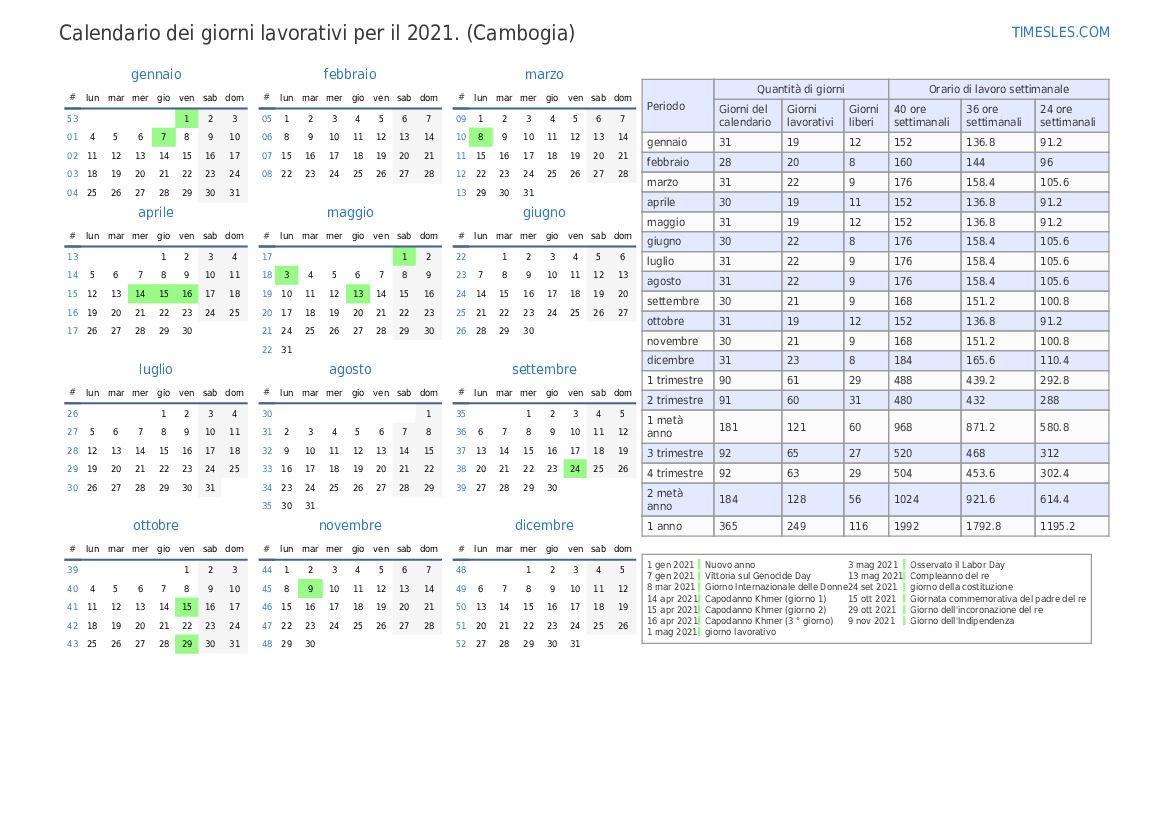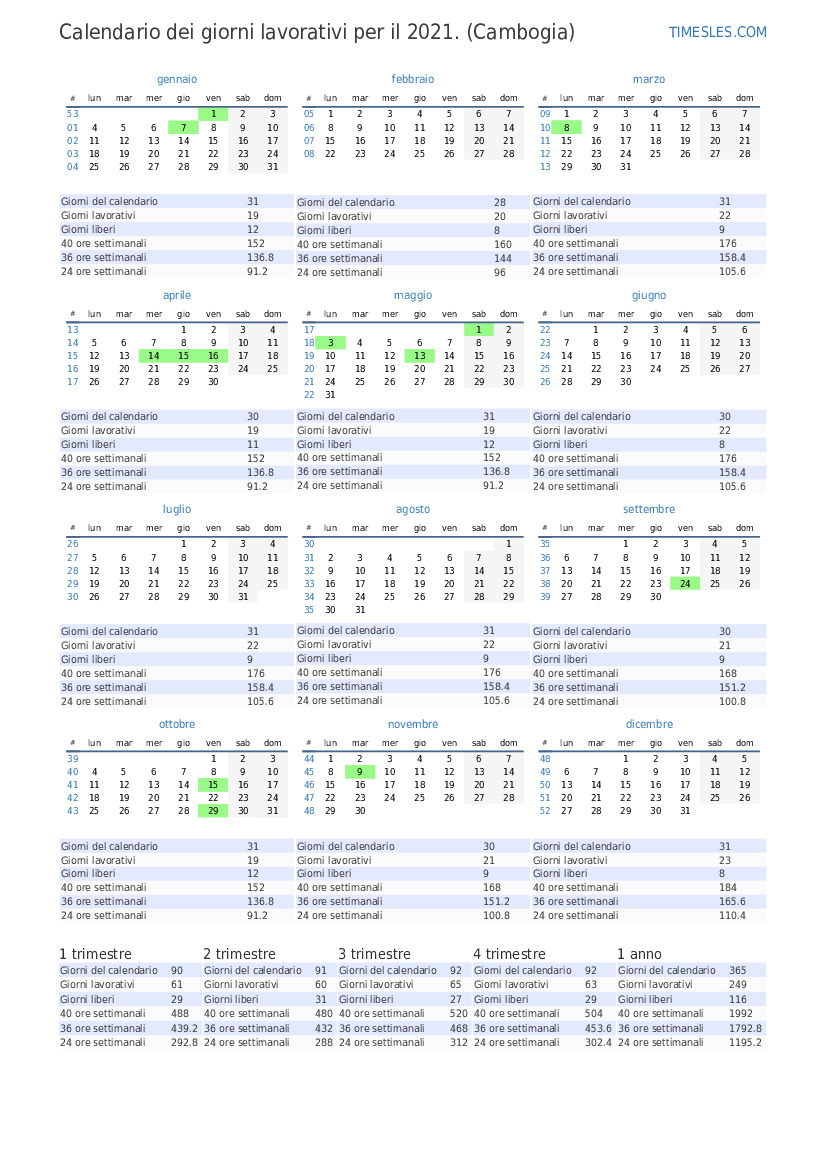 Calendario di dicembre 2021 giorni lavorativi per la Cambogia