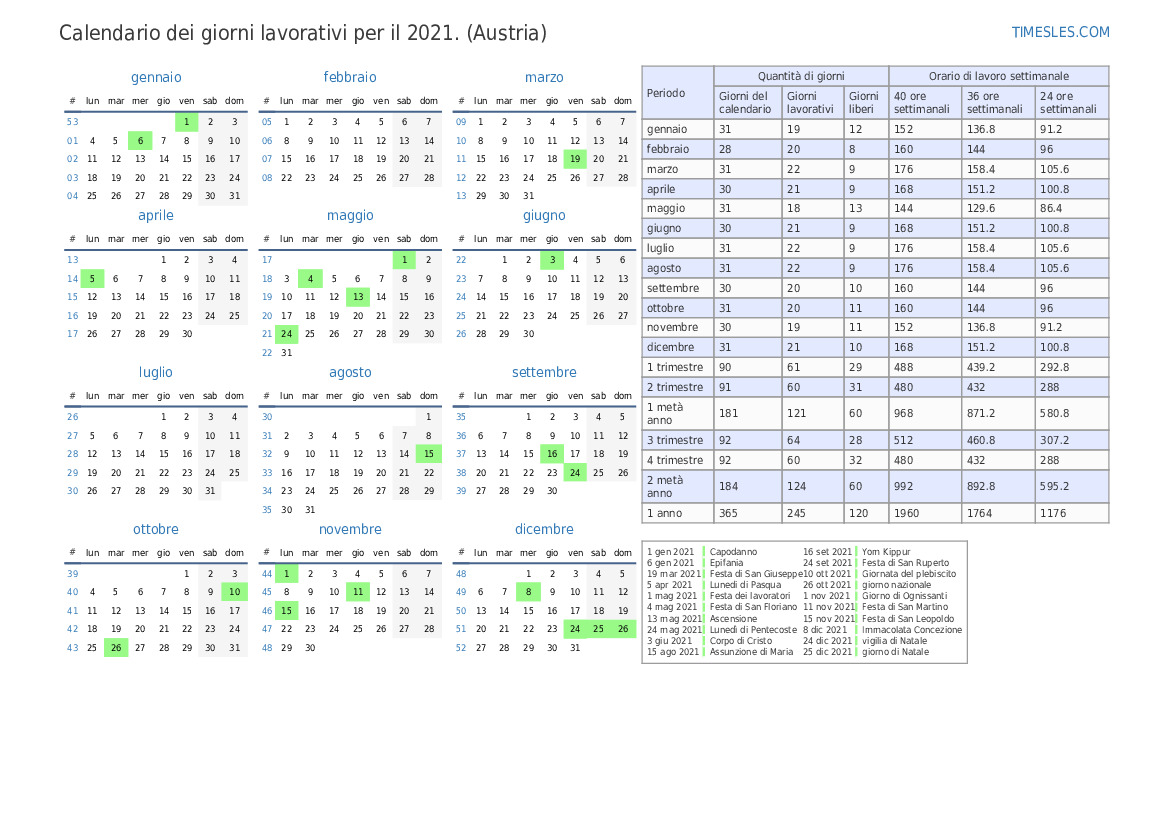 Scarica e stampa il calendario dei giorni lavorativi in PDF con giorni festivi e fine settimana per il 1 trimestre 2021 per l'Austria