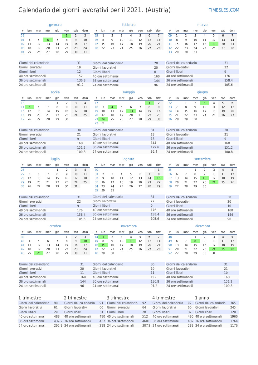 Per il 1 trimestre del 2021, ci sono 6 giorni di ferie e di riposo in Austria. Il 1 trimestre 2021 inizia il di venerdì e termina il di mercoledì.